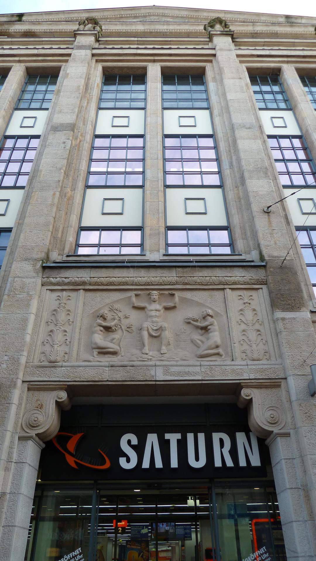Steinrelief über dem ehemaligen Haupteingang des Kaufhauses Alsberg (jetzt: Kortumhaus) und weitere Schmuckelemente