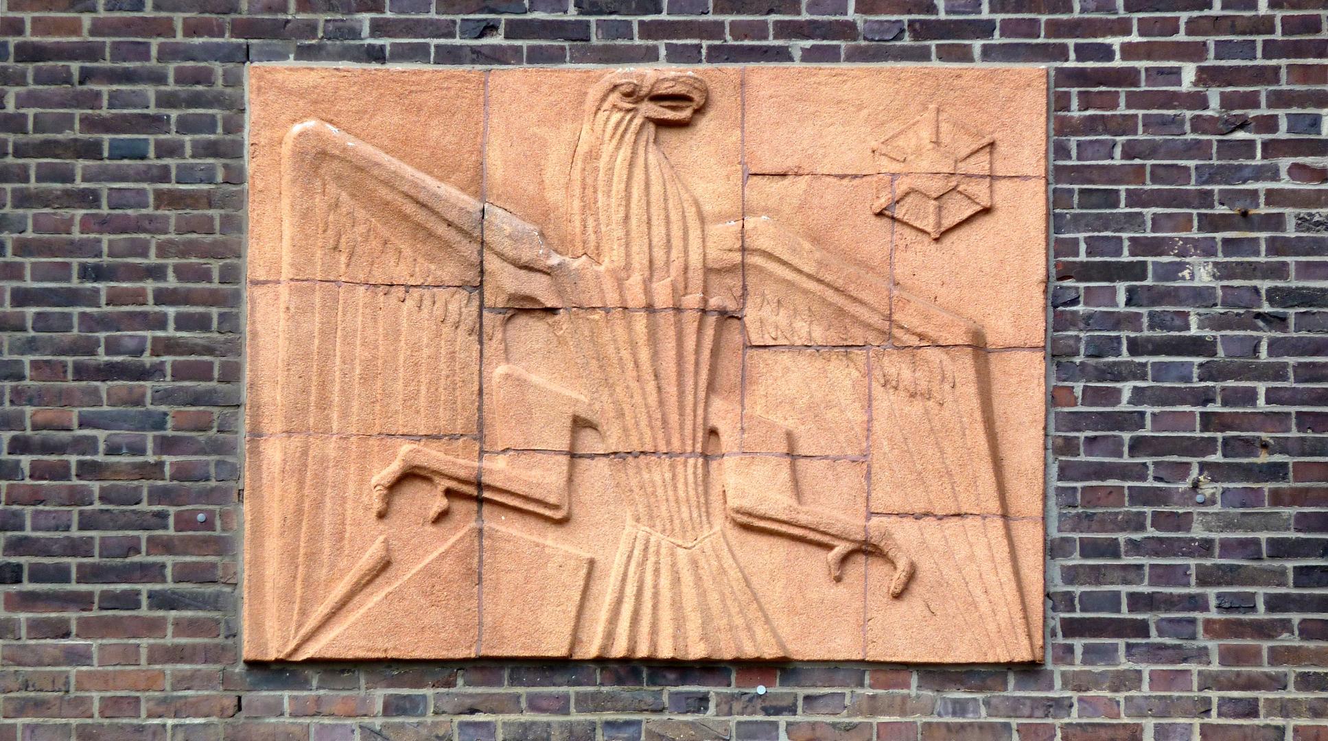 Links oberhalb des Haupteinganges befindet sich das Hoheitszeichen als Kalksteinrelief mit dem expressiv stilisierten deutschen Reichsadler.