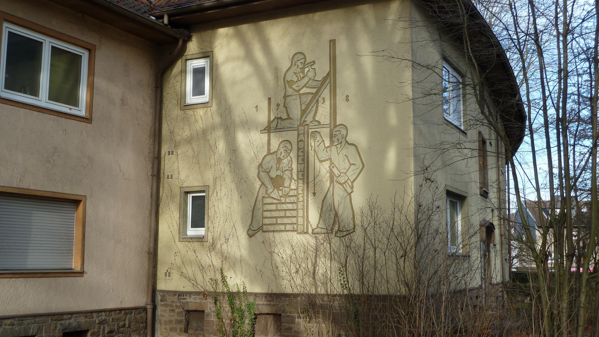 Vor diesem Hintergrund ist es erstaunlich, dass ein 1938 angefertigtes Sgraffito den Baugewerksbund so selbstbewusst und selbstverständlich darstellen kann. Die Annahme, dass das Sgraffito erst im Zuge des Wiederaufbaus nach dem Zweiten Weltkrieg entstand, würde den Widerspruch auflösen.