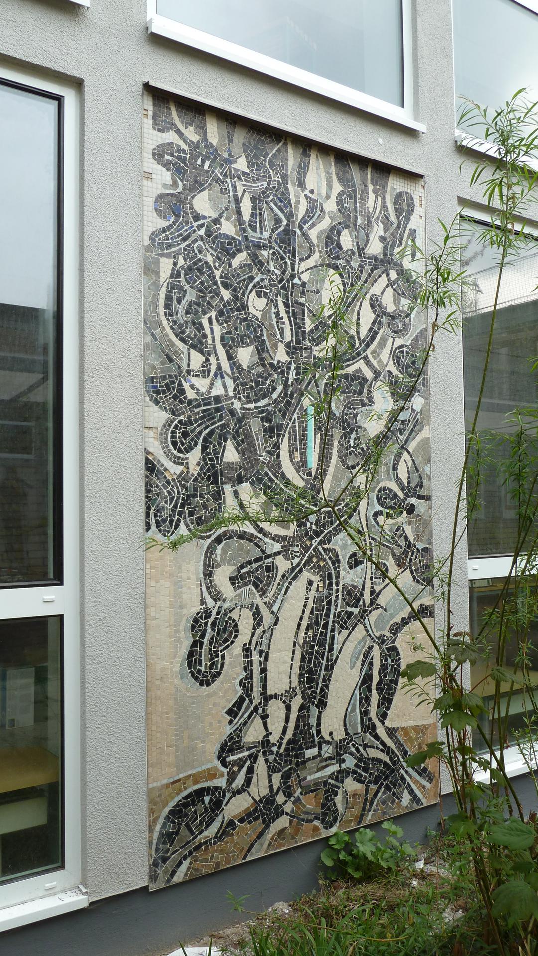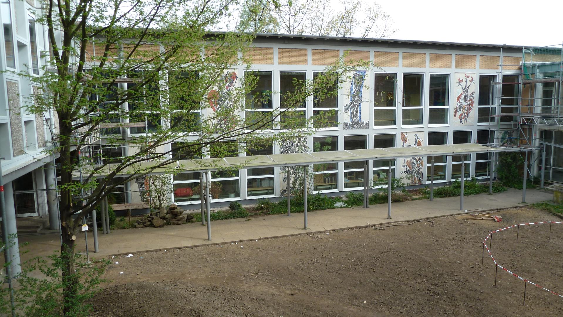 Im Innenhof der Schule hat Heinrich Wilthelm 14 Glasmosaike gestaltet, die im Wechsel mit den Fensterflächen die Wände zum Leben bringen. Die bewegten, abstrakten Bilder erschließen sich nicht auf den ersten Blick. Sie erinnern stilistisch an farbige Linolschnitte. Dargestellt sind Themen aus antiker Mythologie und Dichtung.