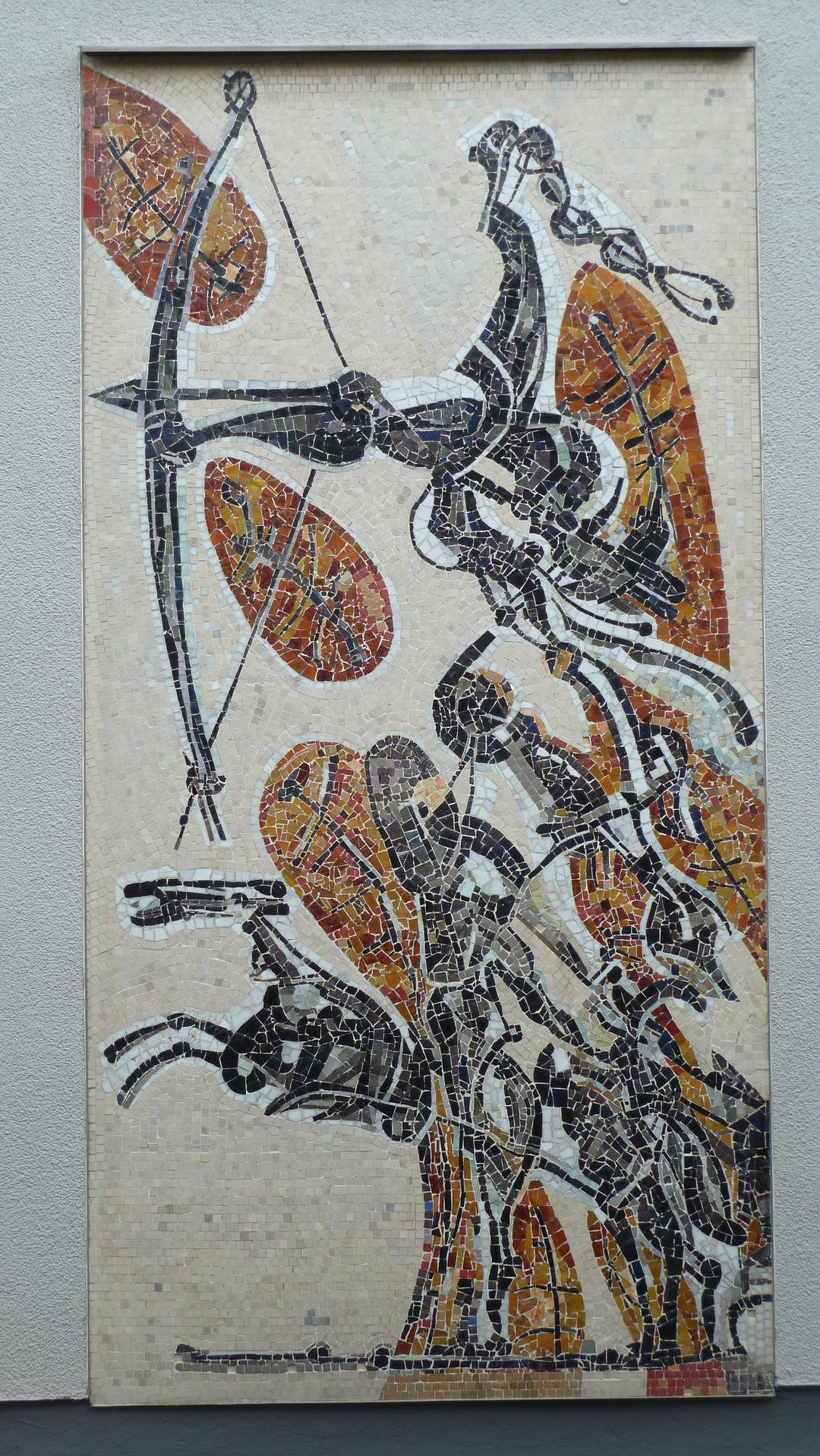 Die Mosaike aus Muranoglas sind abstrakte Darstellungen symbolischer Zusammenhänge. „So wird etwa der Begriff des Sehens oder Schauens bildhaft gefaßt in der Andeutung eines menschlichen Kopfprofils, in dem das Auge – das Auge des Dichters – symbolhaft dominiert. Ein Eichbaum deutet auf das Verwurzeltsein im heimatlichen Boden, ein Vogelflug übers Meer hin auf das Fernweh, Diana mit dem Bogen auf Anmut und Freiheit, der Vogel Phönix auf das Emporschwingen in die geistige Welt, der Griechengott Pan auf die Ursprungswelt unserer Kultur.“ (Ruhr-Nachrichten, 2.12.1961)