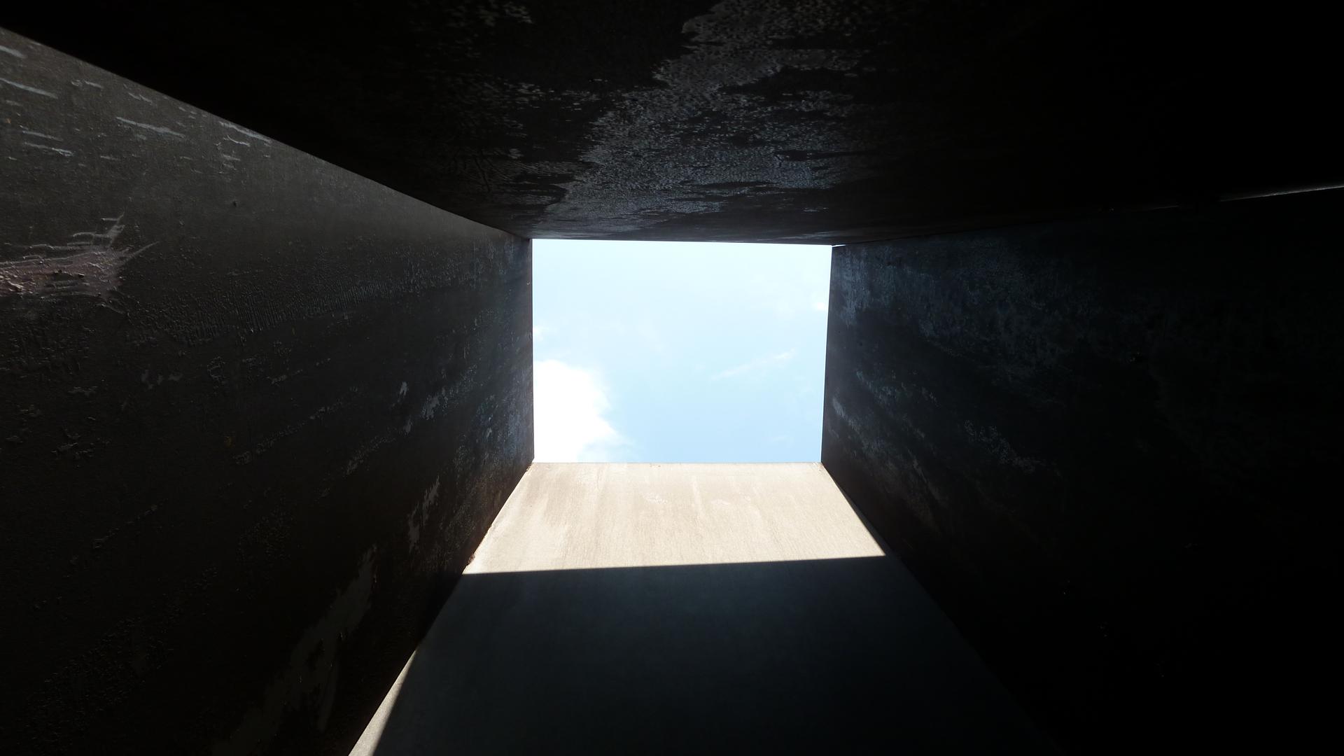 Das Terminal ist ebenso einfach wie vertrackt. Auf den ersten Blick ist es ein simples Kartenhaus aus rechteckigen Stahlplatten. Auf den zweiten Blick muss ein dritter und vierter folgen, um zu erkennen, dass das Terminal sich dem Betrachter aus jeder Perspektive anders präsentiert. Die Wahrnehmung der Skulptur ist abhängig vom Standpunkt des Betrachters. Die Skulptur scheint jederzeit kippen zu können. Der größte Widerspruch offenbart sich im Innenraum: Der sichtbare Himmelsausschnitt bildet ein perfektes Quadrat.