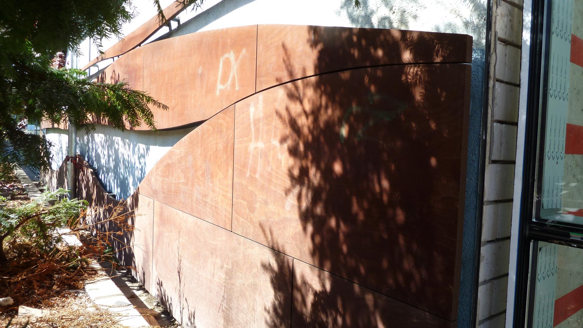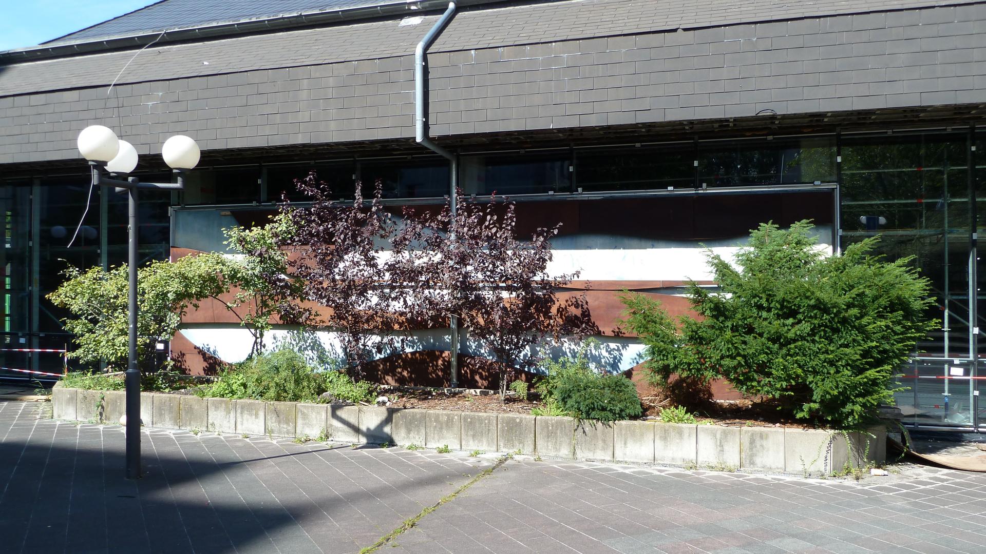 Das Relief an der Südfassade des Hallenbades im Unicenter könnte auf den ersten Blick ein weiteres Kunstwerk aus rostigem Stahl sein. Bei näherem Hinsehen erkennt man aber das Material Holz. Es handelt sich um in einem speziellen Verfahren wetterfest verleimtes Buchenholz. Die Wellenlinien bilden einen passenden Bezug zur Wasserfläche im Inneren. Warum das Relief hinter einer großzügigen Bepflanzung versteckt wird, ist nicht nachvollziehbar.