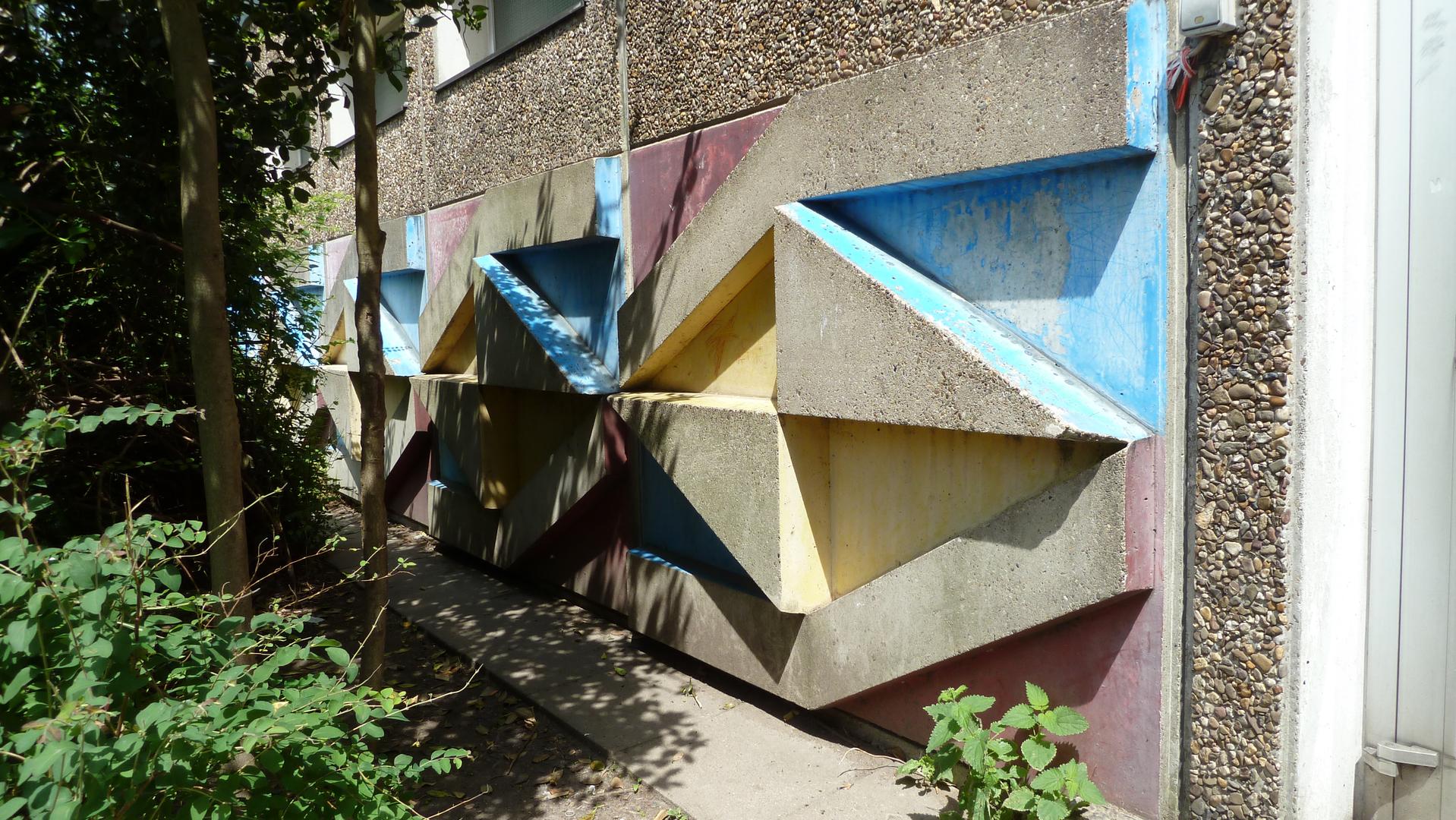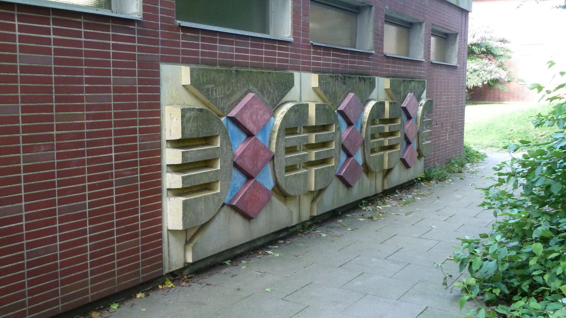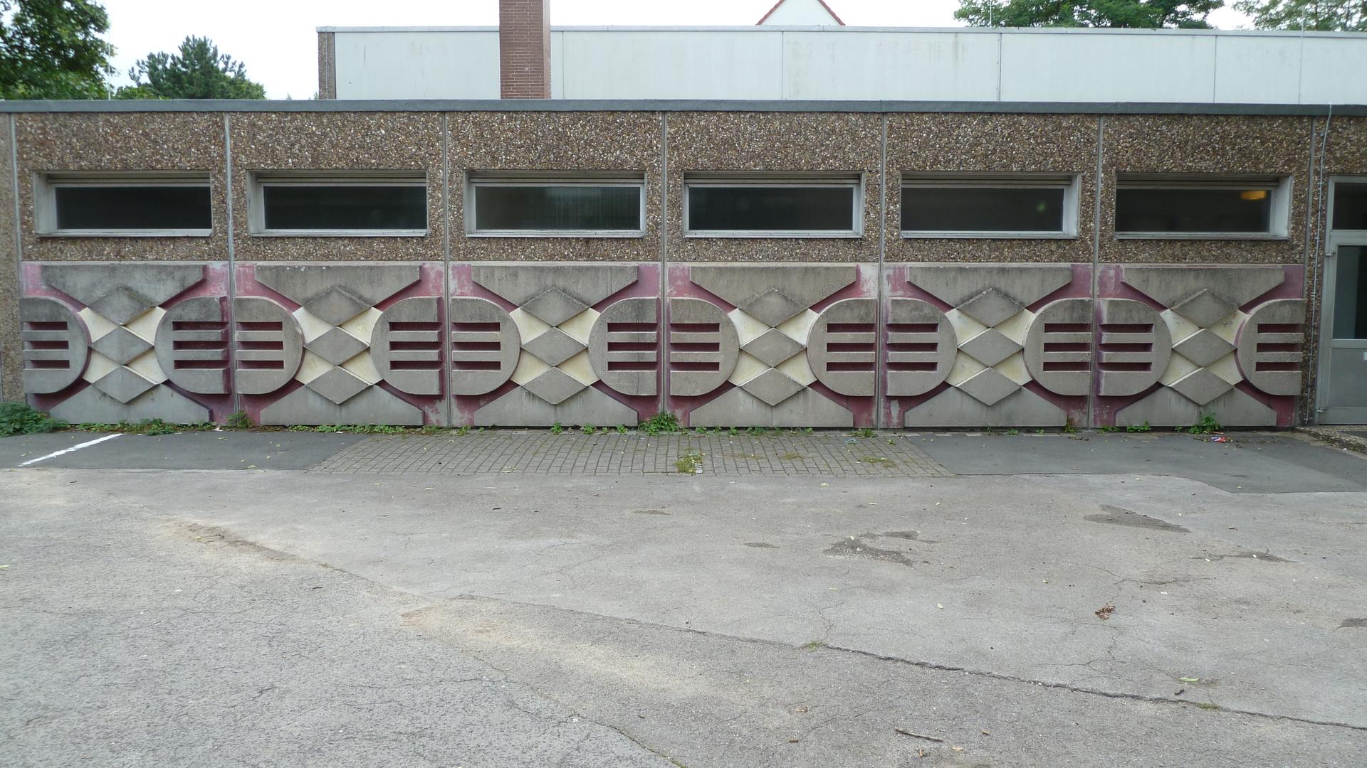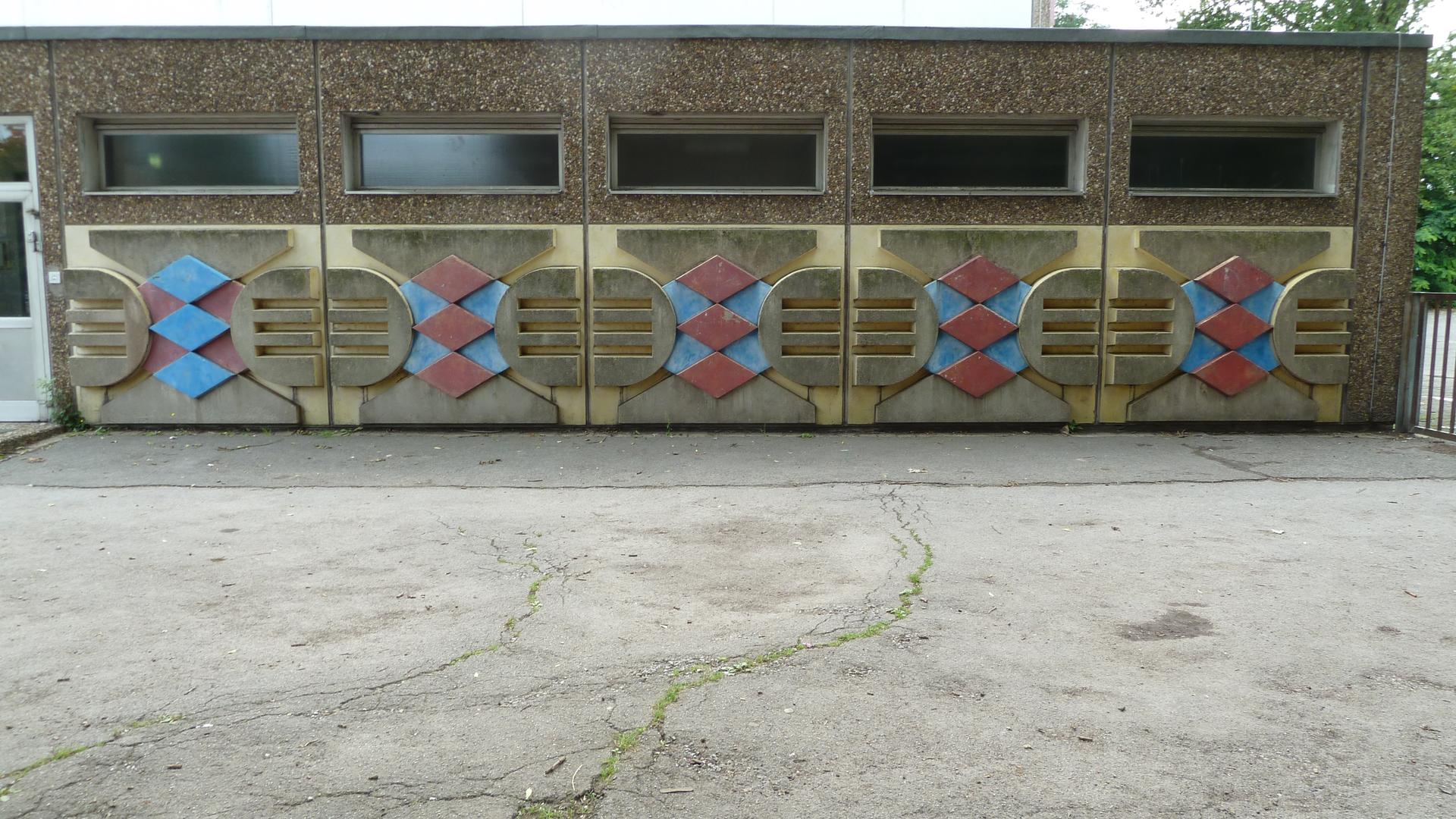 Die Wandreliefs an allen Schulgebäuden sind aus vorgefertigten, standardisierten „multiplen Elementen“ zusammengesetzt und ergeben durch unterschiedliche Drehungen und horizontale oder vertikale Anordnungen der Elemente abwechslungsreiche geometrische Kompositionen. Zusätzlich wurden die Reliefs mit den Grundfarben Rot, Gelb und Blau farbig gestaltet. Auf der Basis des genormten Ausgangsmaterials entstand eine vielgestaltige, farbige Kunst, die zudem kostengünstig herzustellen war.