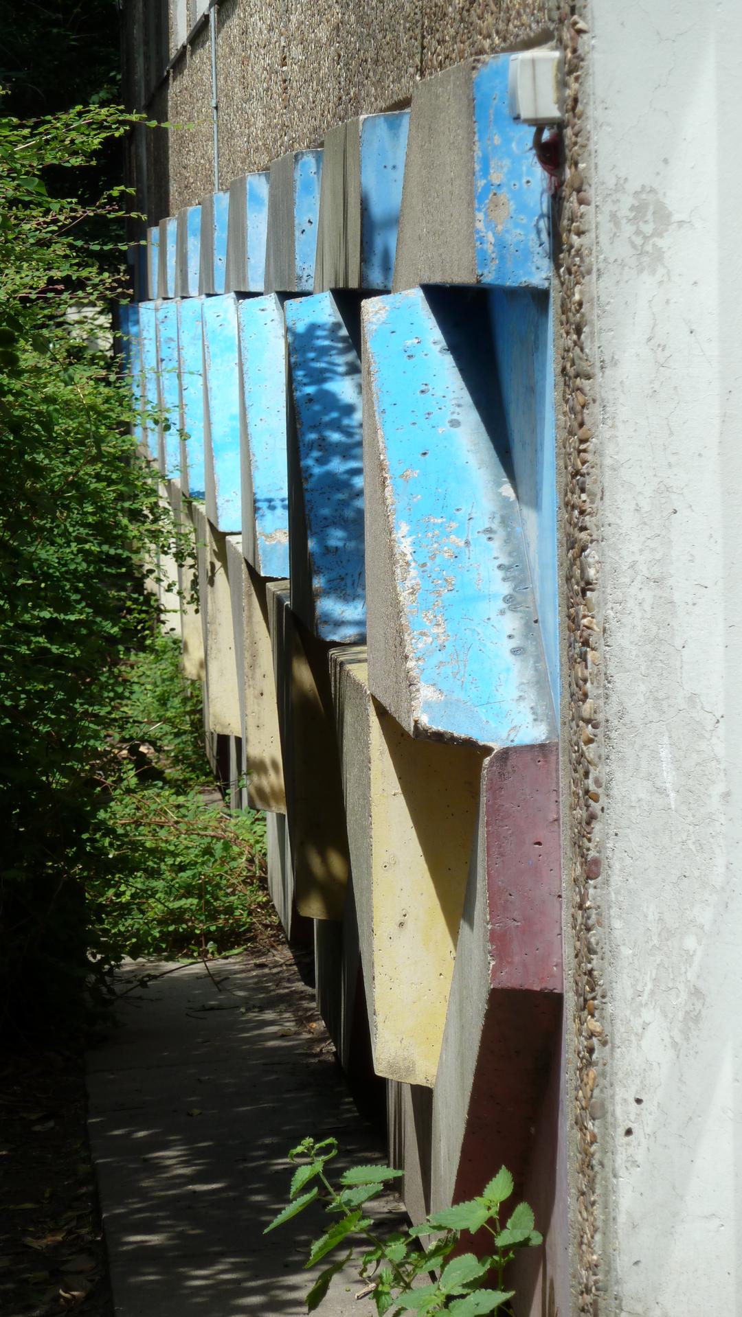 Für das Schulzentrum gestaltete Hajek im Unterschied zu den anderen Schulen nicht nur Gebäudefassaden, sondern zusätzlich eine farbige Beton-Plastik auf dem Schulhof, das Maßzeichen .
