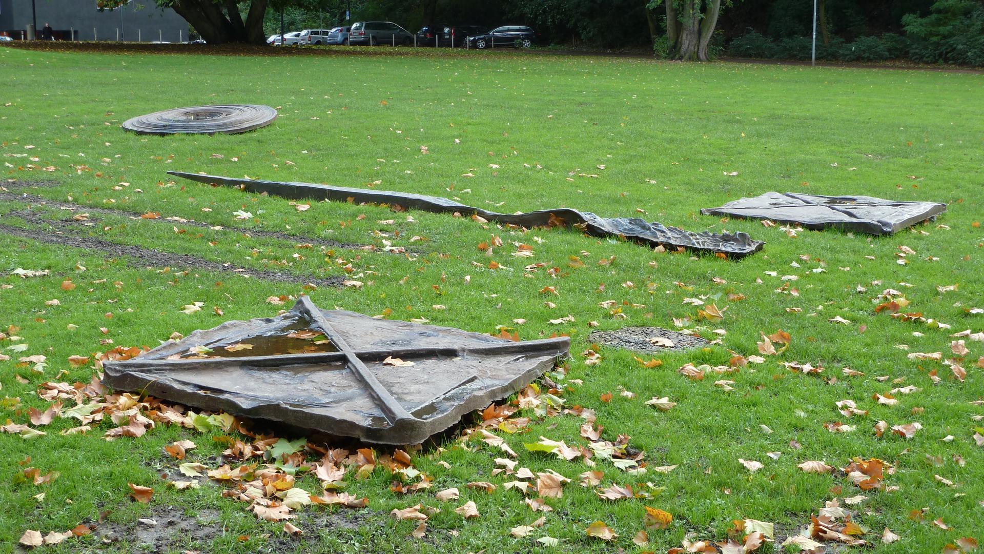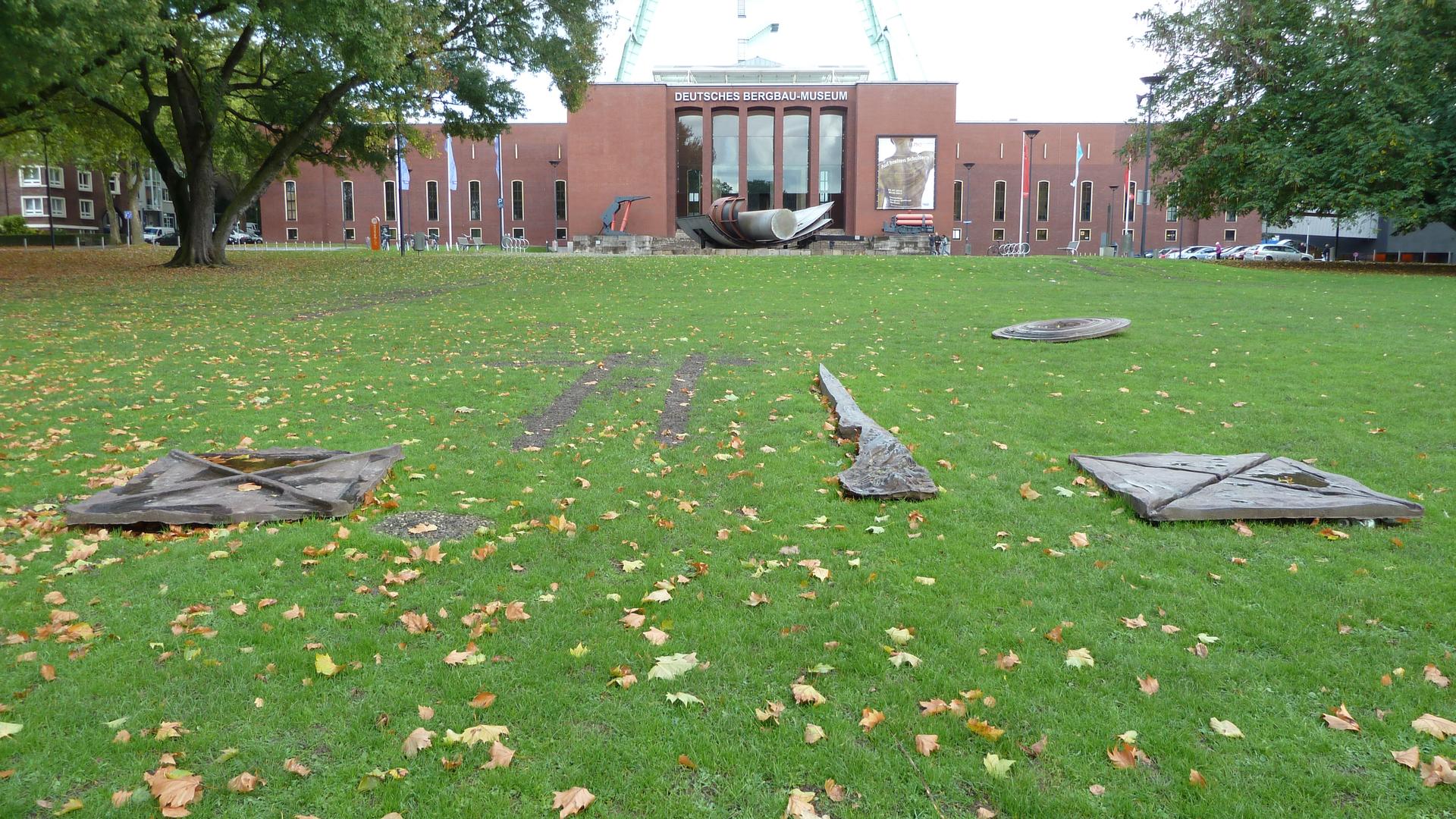 In den Kontext der Archeologia gehört die vierteilige Installation auf der Wiese vor dem Bergbaumuseum. Der auf den Förderturm ausgerichtete 5 m lange Speer des Achill wird an seinem flammenumzüngelten Ende von zwei deckungsgleichen Quadraten flankiert. Neben der Spitze liegt eine runde Scheibe, der Schild. Flach auf dem Rasen liegend, teilweise eingesunken, ist die Installation von den Wegen her nahezu unsichtbar. Verborgene Kunst. Man muss heran- und herumgehen wie auf einem Schlachtfeld oder einer Grabungsstätte, um zu verstehen.