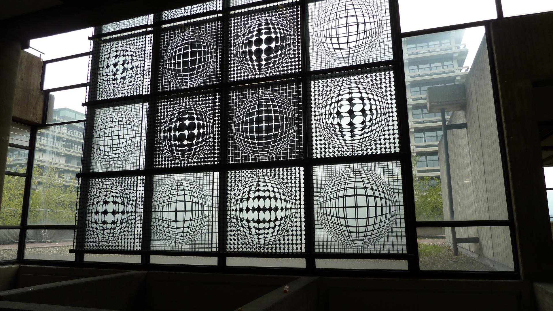 Andererseits lässt die elementare, geometrische Formensprache von Albers, Vasarely oder Fruhtrunk eine gesteigerte Nachbarschaft zur Rationalität der Betonarchitektur vermuten, so dass eine Homogenität zwischen Architektur und Kunst suggeriert wird.