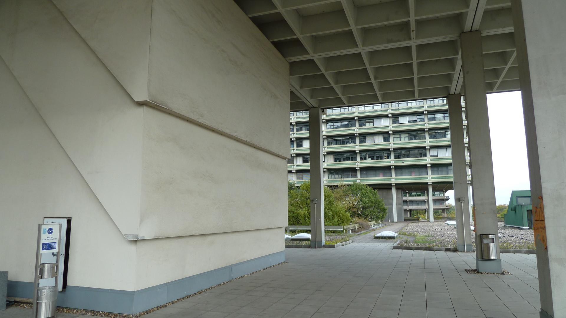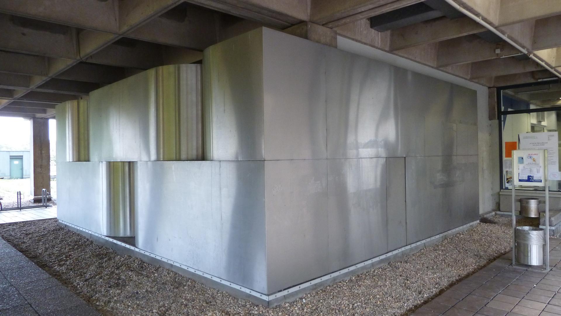 Jos Manders setzte glatte Wände mit abgerundeten Ecken vor den Versorgungskern NC-Nord. An einer Ecke schwingen die Wände nach innen und bilden einen Hohlraum. Dort sollte eine akustische Installation angebracht werden, die nicht realisiert wurde.