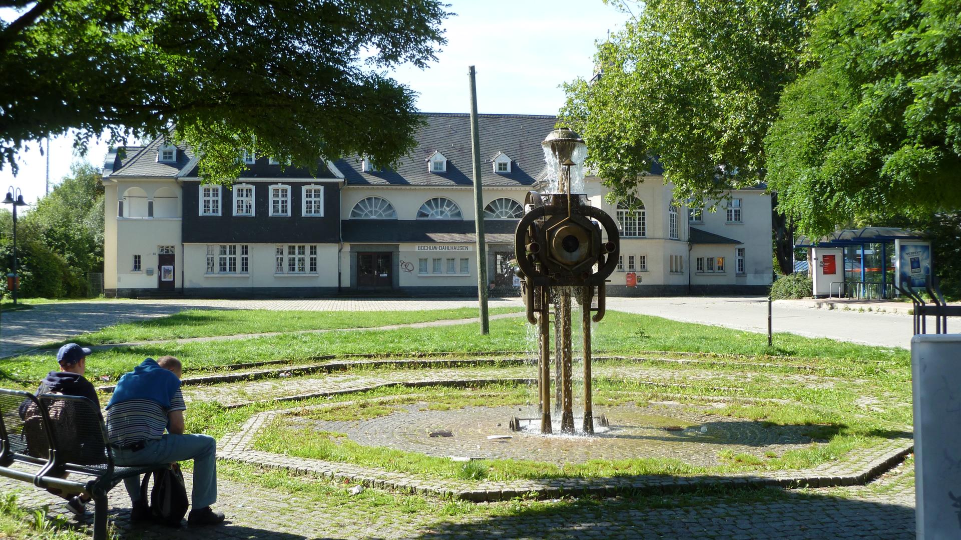 Der Brunnen vor dem Bahnhof Dahlhausen in der Nähe des Eisenbahnmuseums widmet sich dem Thema „Lokomotive“. Weil er vom Wasser angetriebene bewegliche Teile hat, heißt er Lokomobile - nicht zu verwechseln mit den gleichnamigen, vor allem landwirtschaftlich genutzten Dampfmaschinen, den Vorläufern der Traktoren. Ursprünglich sollten Lokomotivteile wie Kolben und Räder durch den Wasserdruck angetrieben werden.