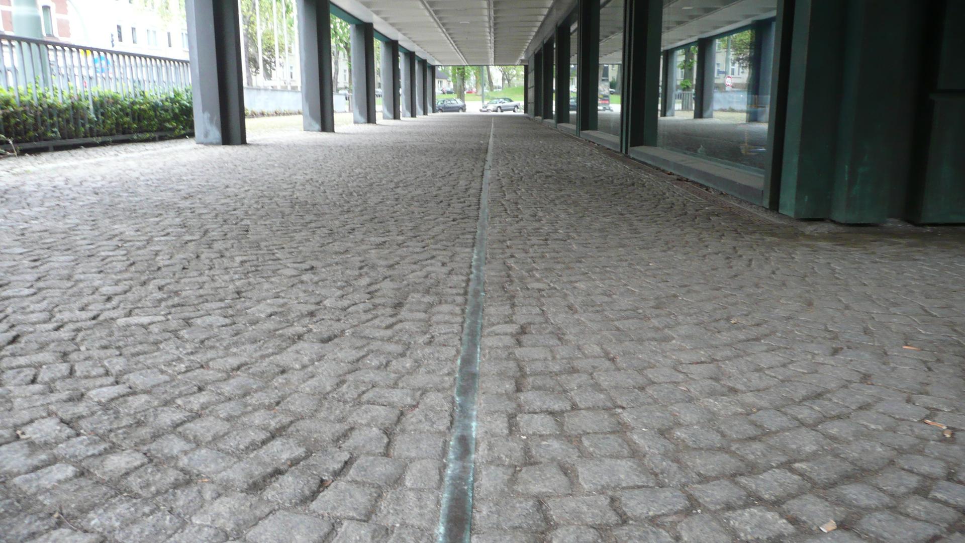 Jiri Hilmars Bodenplastik in der Treppenanlage vor dem Kunstmuseum Bochum ist verborgene Kunst: Das Kunstobjekt ist nicht auf den ersten Blick als solches erkennbar. In dem Kleinpflaster der Terrasse vor dem Museum der Treppe ist eine Bronzeschiene verlegt, die auf eine Treppe zu und über die Stufen hinab auf eine Bronzescheibe führt .