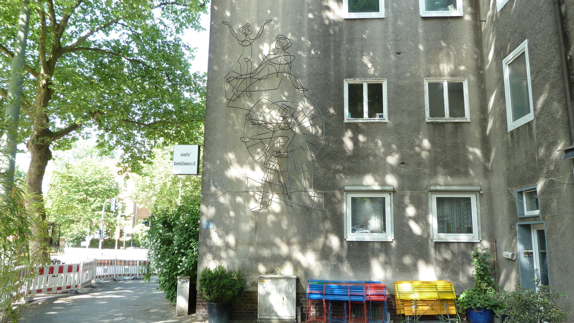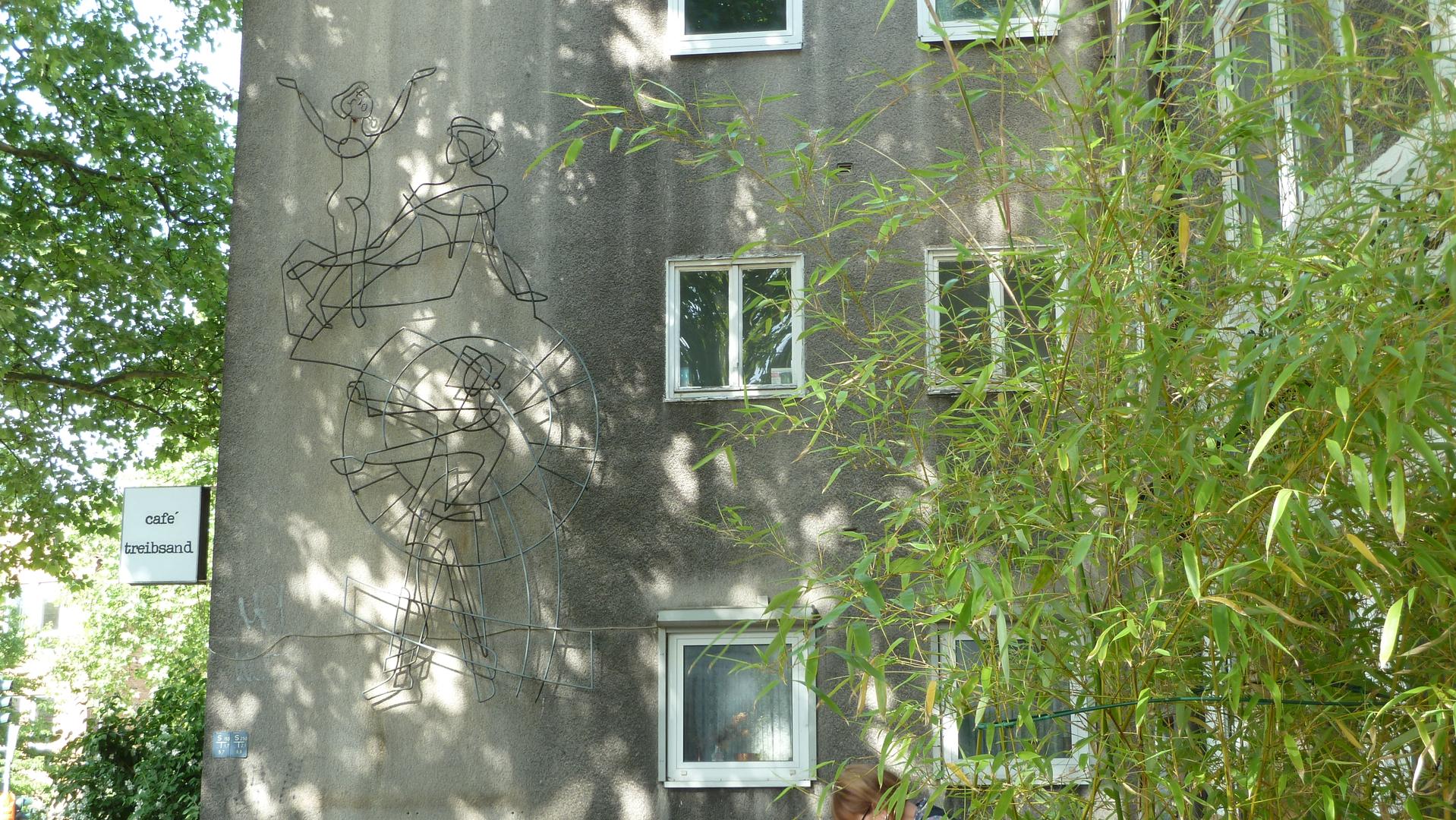 Ein typisches Beispiel für Kunst am Bau der Nachkriegszeit in den 1950er Jahren ist an der Castroper Straße erhalten. Gut verborgen fällt es nur an schönen Sonnentagen den Freiluft-Gästen des Café Treibsand ins Auge. Die Gestaltung ist zeittypisch abstrahiert, die Motive sind unbeschwerte heile Welt: Urlaubsatmosphäre.