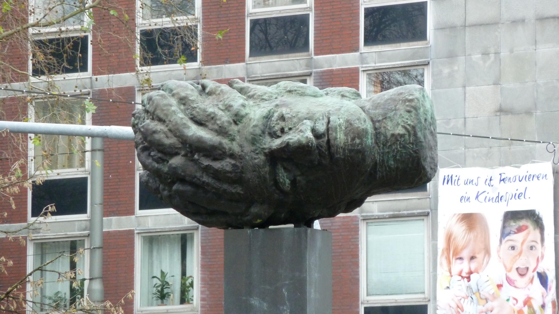 Der Mensch ist ein Querkopf - man sieht es nur nicht gleich. Auch die Frage, wo nun vorne und wo hinten ist, bleibt offen. Nur vom Schauspielhaus her ist die Skulptur als Darstellung eines Kopfes erkennbar. Auf das Schauspielhaus blickend, bleibt das Objekt rätselhaft. Signiert ist die Stele allerdings auf dieser Seite.