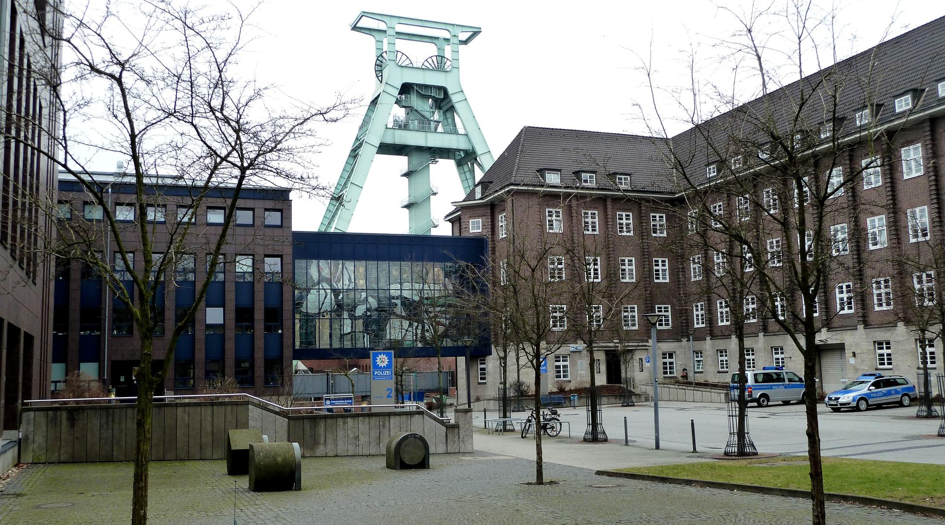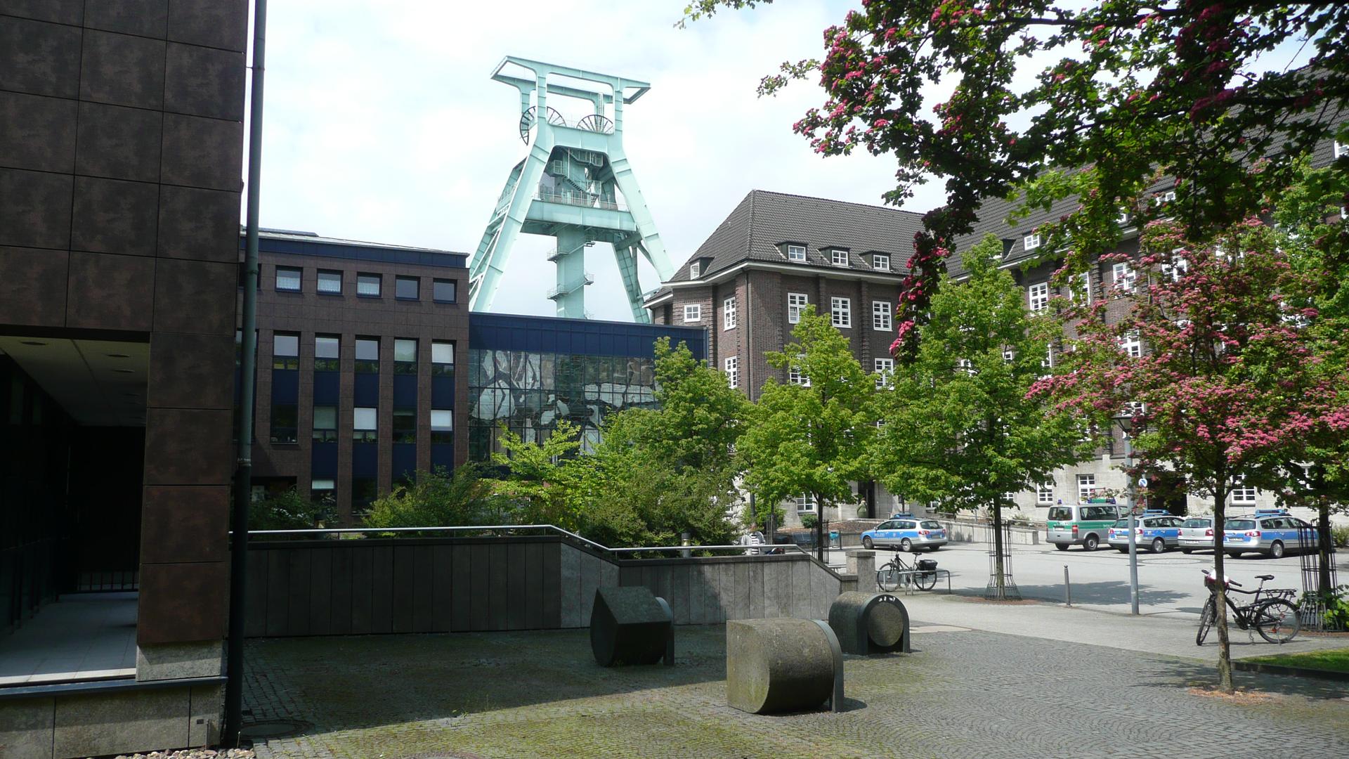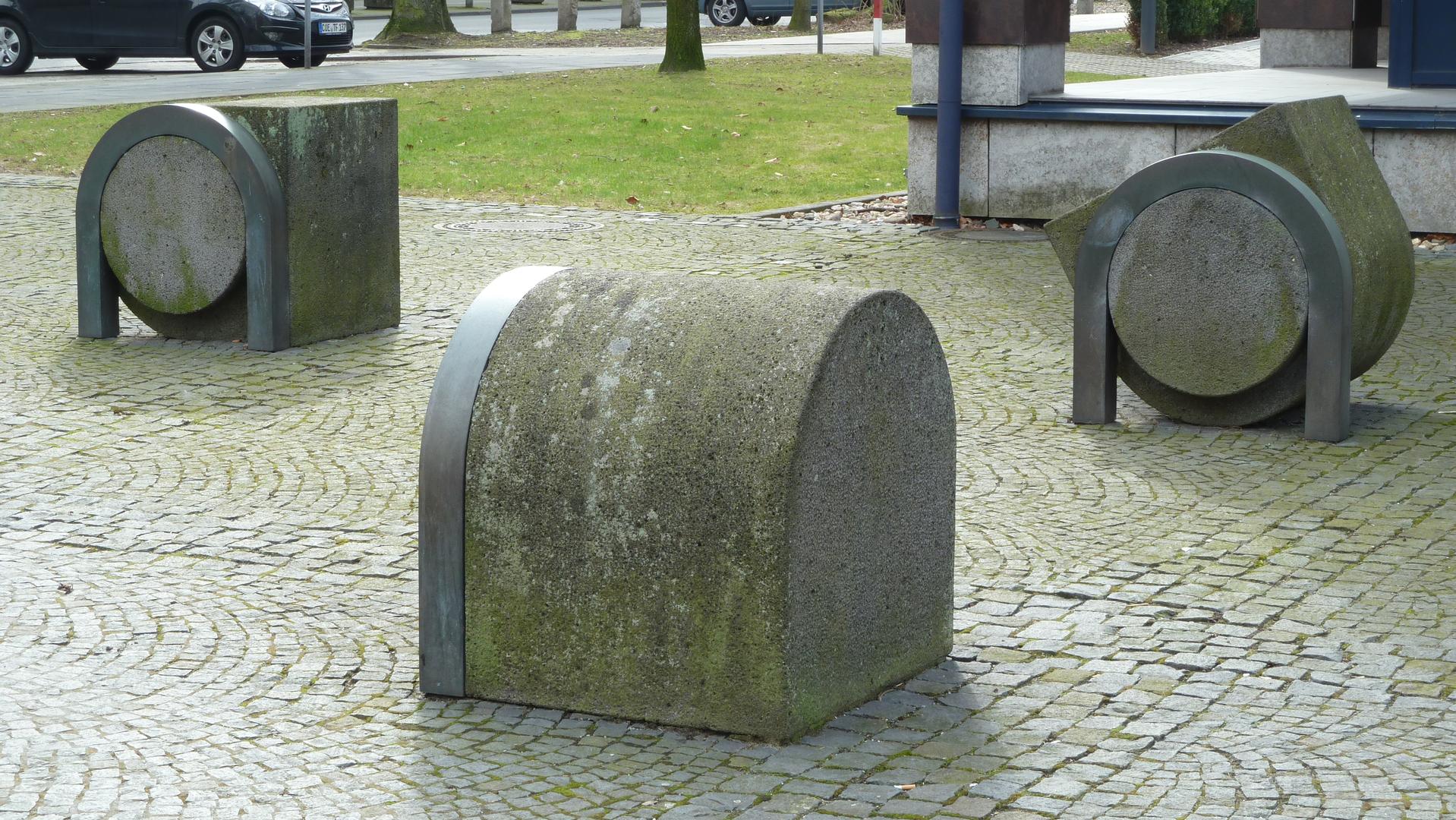 Bei der dreiteiligen Installation Zylinder XXXX, 1-3 am Polizeipräsidium Bochum gehört die Anordnung der drei neu gepflanzten Ahornbäume ebenso zur Definition des Raumes wie die unscheinbare Bezugnahme des flächig aufliegenden Elements zu der Wölbung der im Hintergrund parallel verlaufenden Begrenzungsmauer, die Diethelm Koch seit Kindertagen kannte.