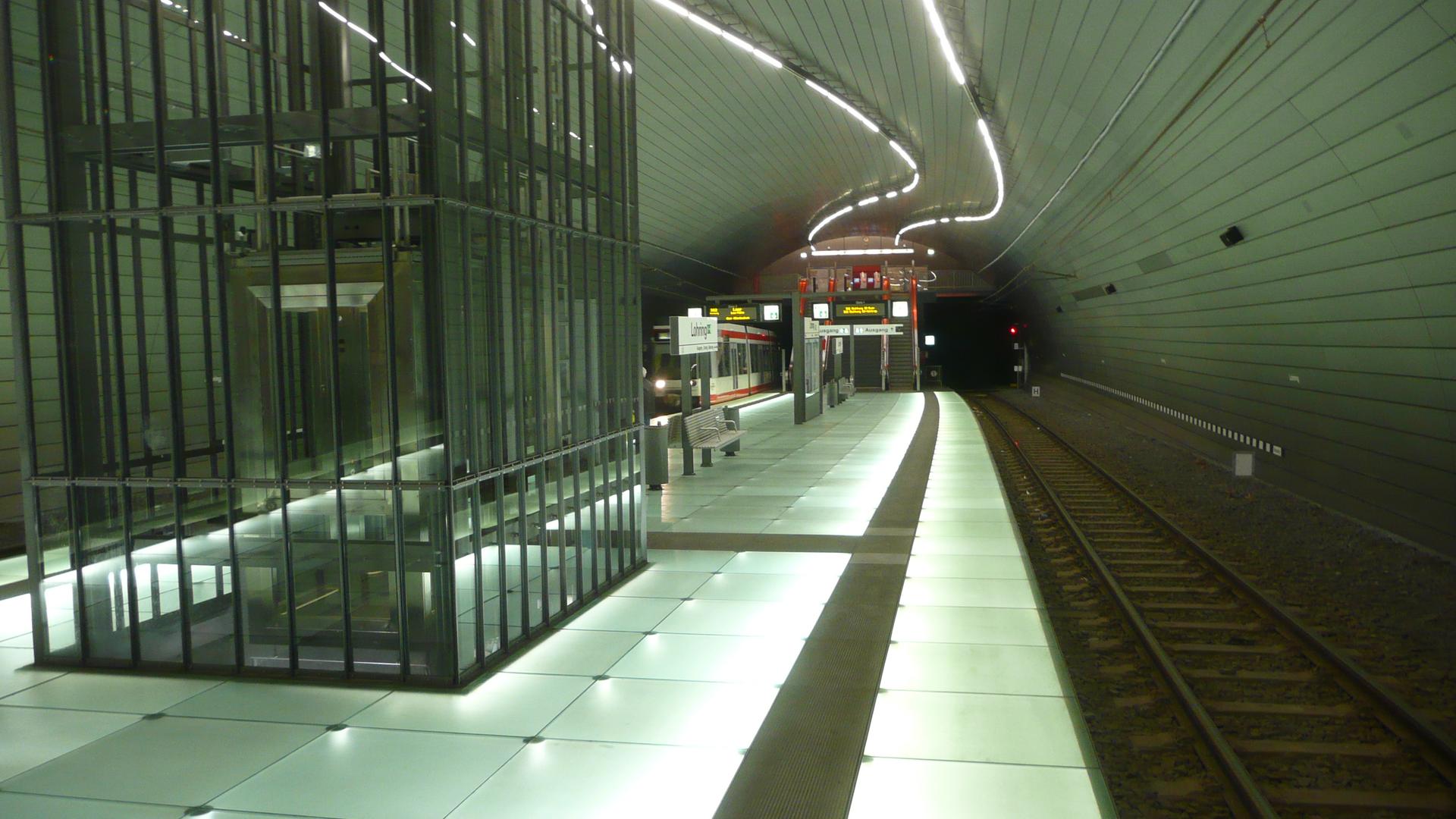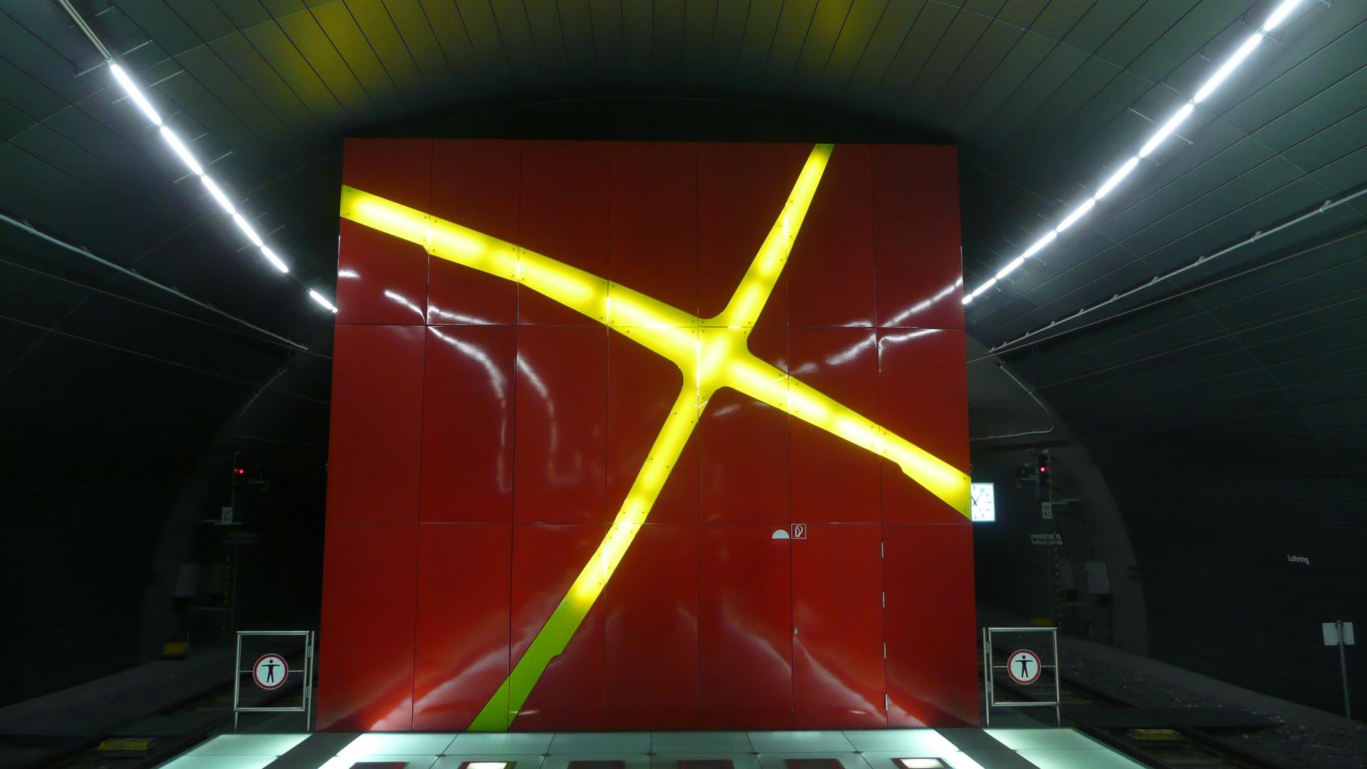 Holger Rübsamen: Ausgangspunkt war im konkreten Fall des U-Bahnhofs Lohring dieser beeindruckende unterirdische Raum, ein leicht geschwungenes, rund 100 Meter langes Gewölbe. Wir fanden schnell die auf wenige Aussagen reduzierte architektonische Konzeption - der freie Blick in den durch Einbauten unberührten Raum, ein beleuchteter Glasboden, darauf alle technischen Einrichtungen, am Ende als Raumbegrenzung die rote Wand. Der Gedanke, dass der Abstraktionsgrad dabei vielleicht zu groß werden könnte, hat uns dann zur Zusammenarbeit mit Eva-Maria Joeressen geführt, zumal wir zuvor schon bei anderen Projekten die Kooperation mit Bildenden Künstlern gesucht hatten. Eva-Maria Joeressen hat die Konzeption des gelben Lichtkreuzes auf roter Wand und die in Korrespondenz zum beleuchteten Glasboden stehenden Lichtlinien am Gewölbe entwickelt. So verweist zum Beispiel das Lichtkreuz als Abbildung der oberirdischen Kreuzung auf die Verortung des Topos: „102 Meter üNN“, während die Lichtlinien die Bewegungsabläufe der Menschen und der U-Bahn-Züge reflektieren. Später haben wir den Komponisten Klaus Kessner gebeten, sich mit der erstaunlichen Akustik des Raumes zu beschäftigen. Es ist eine Klanginstallation entstanden, deren akustisches Material sich ausschließlich aus dem Ort formiert und die dieses in immer neuen Varianten wiedergibt.