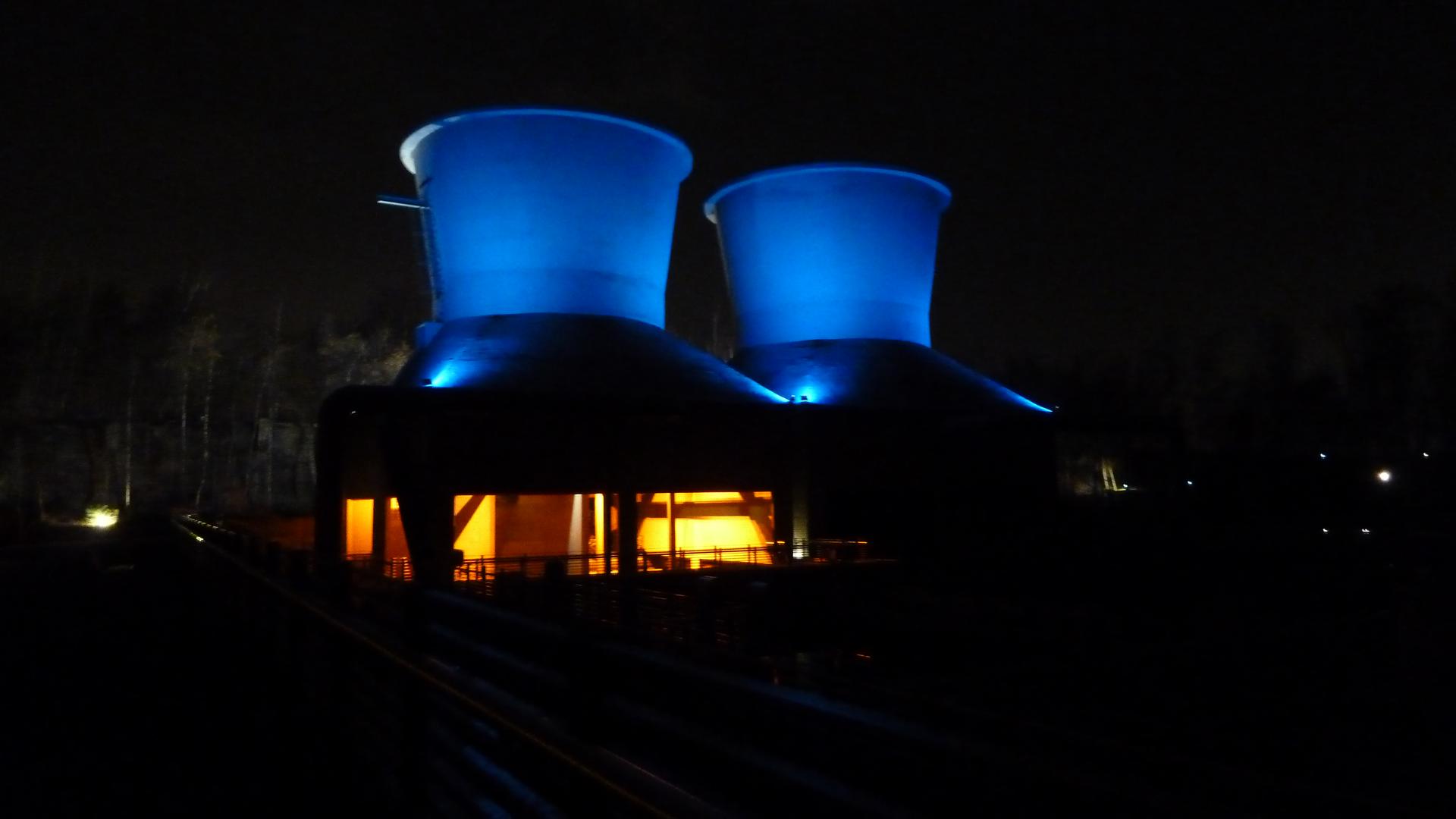 Die nächtliche Beleuchtung ist im Winter 2007 durch die „Wasserwelten“ ergänzt worden. Der Wasserturm neben der Jahrhunderthalle leuchtet grün, die beiden Betonkühltürme leuchtend blau und das Kühlwasserbecken ist orange illuminiert. Weitere Akzente setzen die Innenbeleuchtung abgetrennter Rohrleitungen und die Ausleuchtung der Brücken.