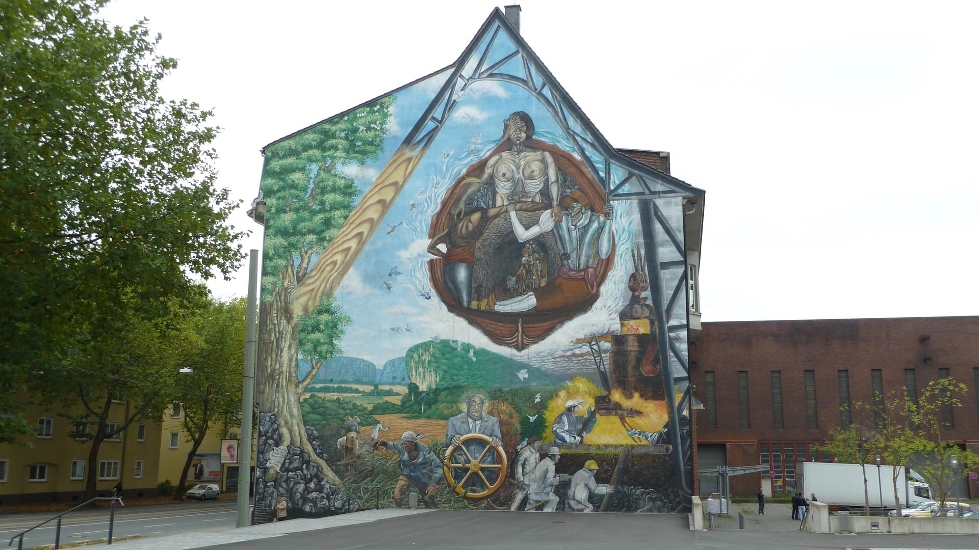 Das 450 m² große Wandbild am Torhaus 5 zeigt auf sinnfällige Weise die nicht immer liebevolle Beziehung zwischen Mensch, Technik und Natur.