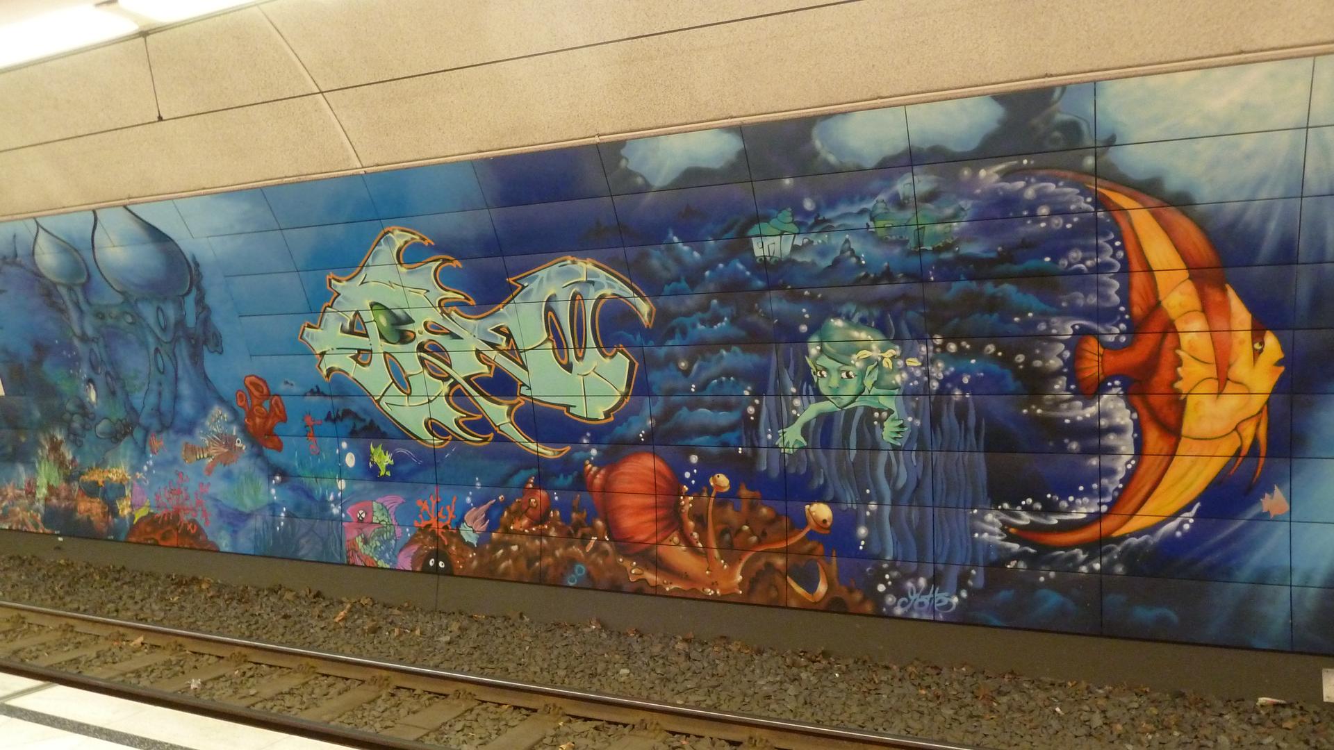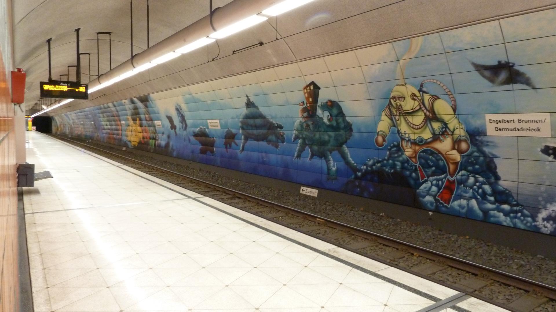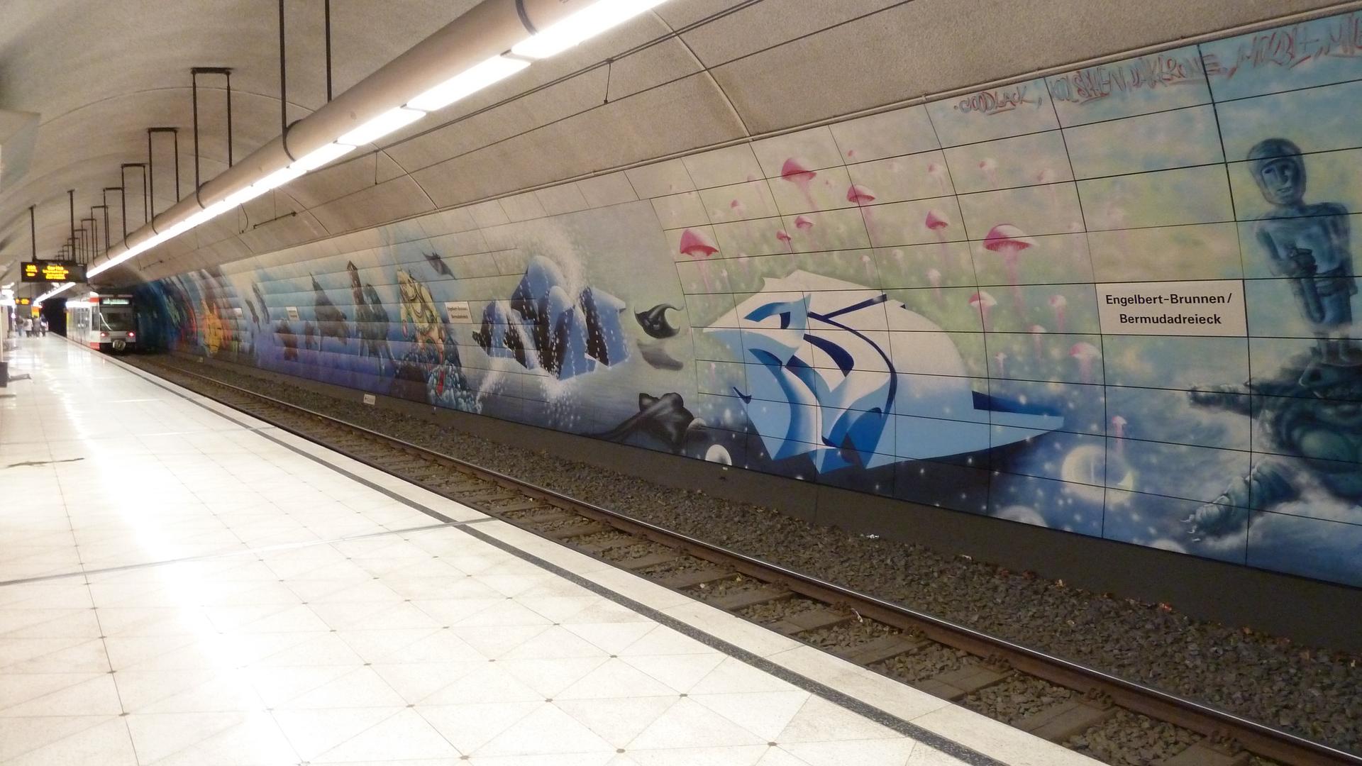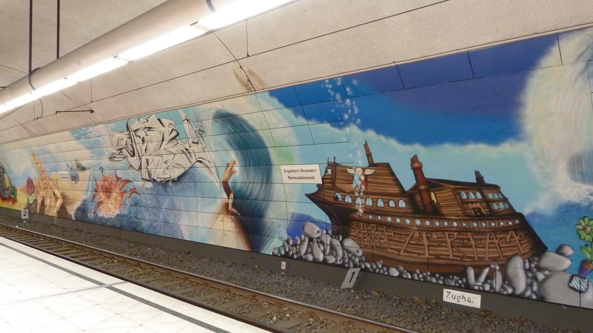Im Rahmen der Renovierung des 1979 eingeweihten Stadtbahn-Bahnhofs wurden 2004 die Tunnelwände der Bahnsteigebene von verschiedenen Künstlergruppen mit zwei je 110 Meter langen Graffiti gestaltet, die mit den Begriffen Bermudadreieck, Unterwasserwelt und Erlebnismeile spielen.