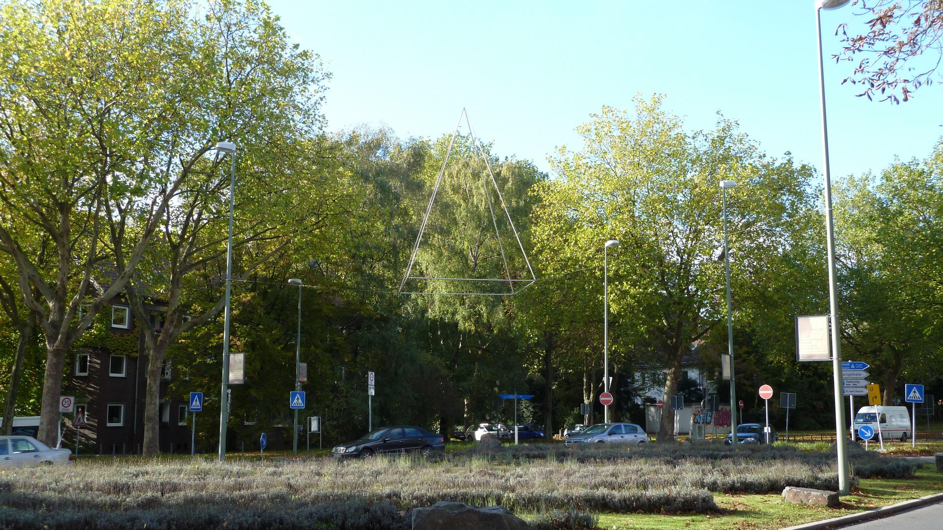 Die Skulptur über dem Kreisverkehr am Stadionring wurde im Rahmen der Ausstellung „und es bewegt sich doch ...“ im Jahr 2006 installiert.