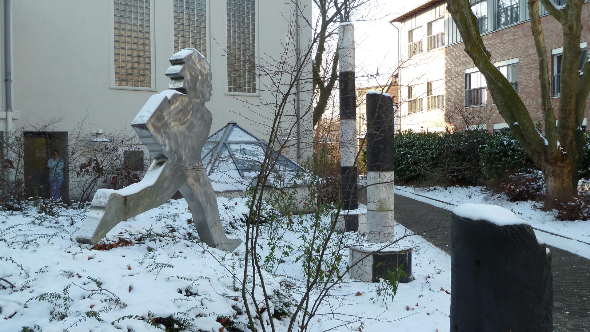 Der Läufer mit den drei Tonsäulen entstand 1992. Das Motiv des Läufers verwendet der Künstler häufiger. Eine ähnliche Arbeit entstand auch in Eschborn.