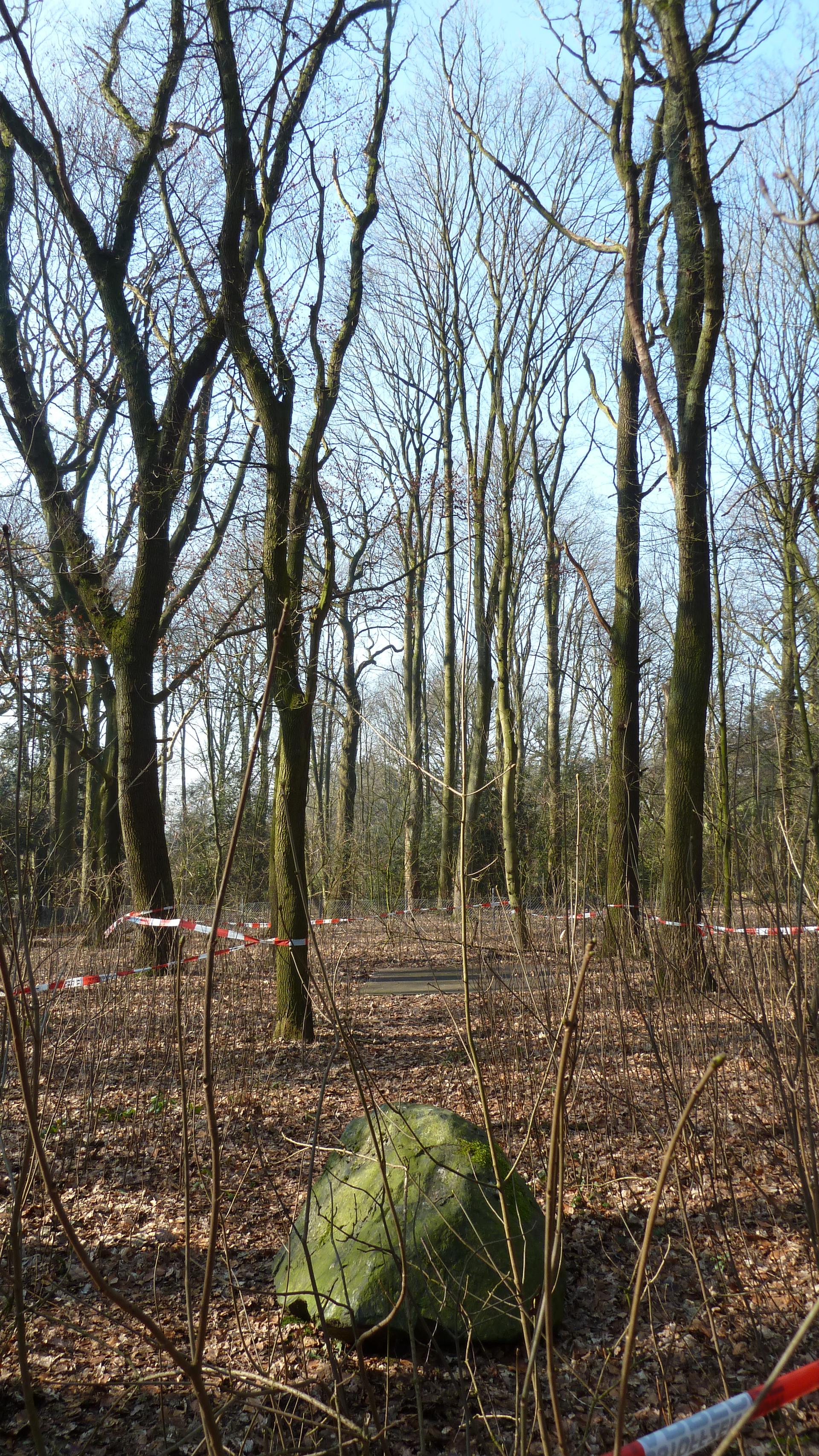 Die Installation Holzwege I ist im Sommer, wenn alles grünt, kaum zu finden. Erst im Winter, wenn am Boden freie Sicht ist, kann man die Installation als Ganzes in den Blick nehmen und es erschließt sich die Idee der Installation.
