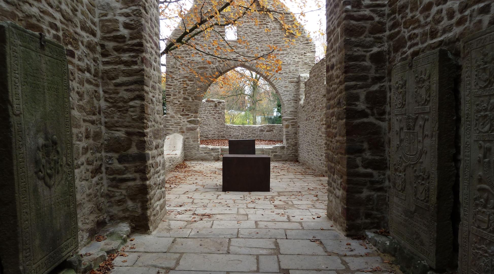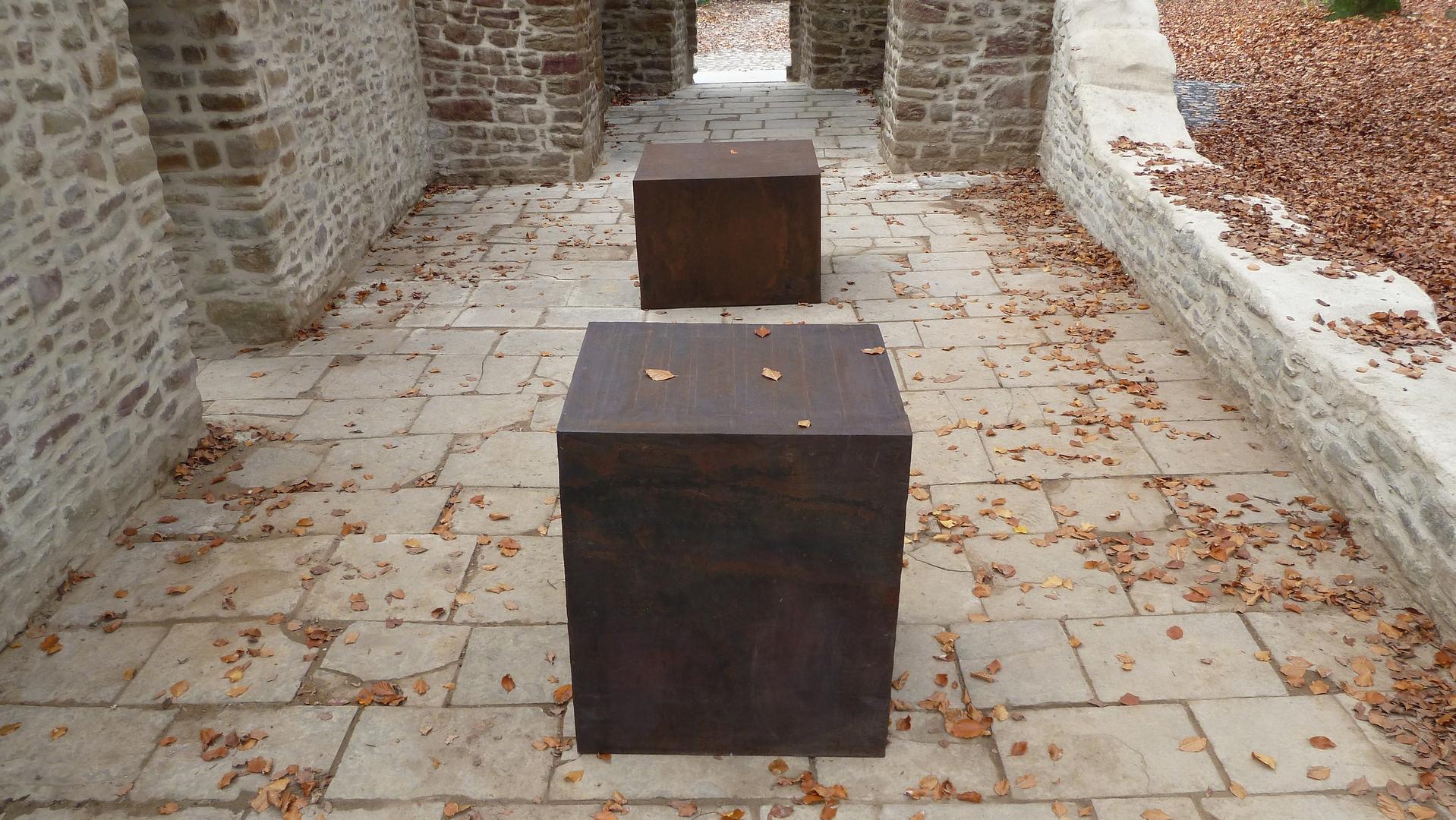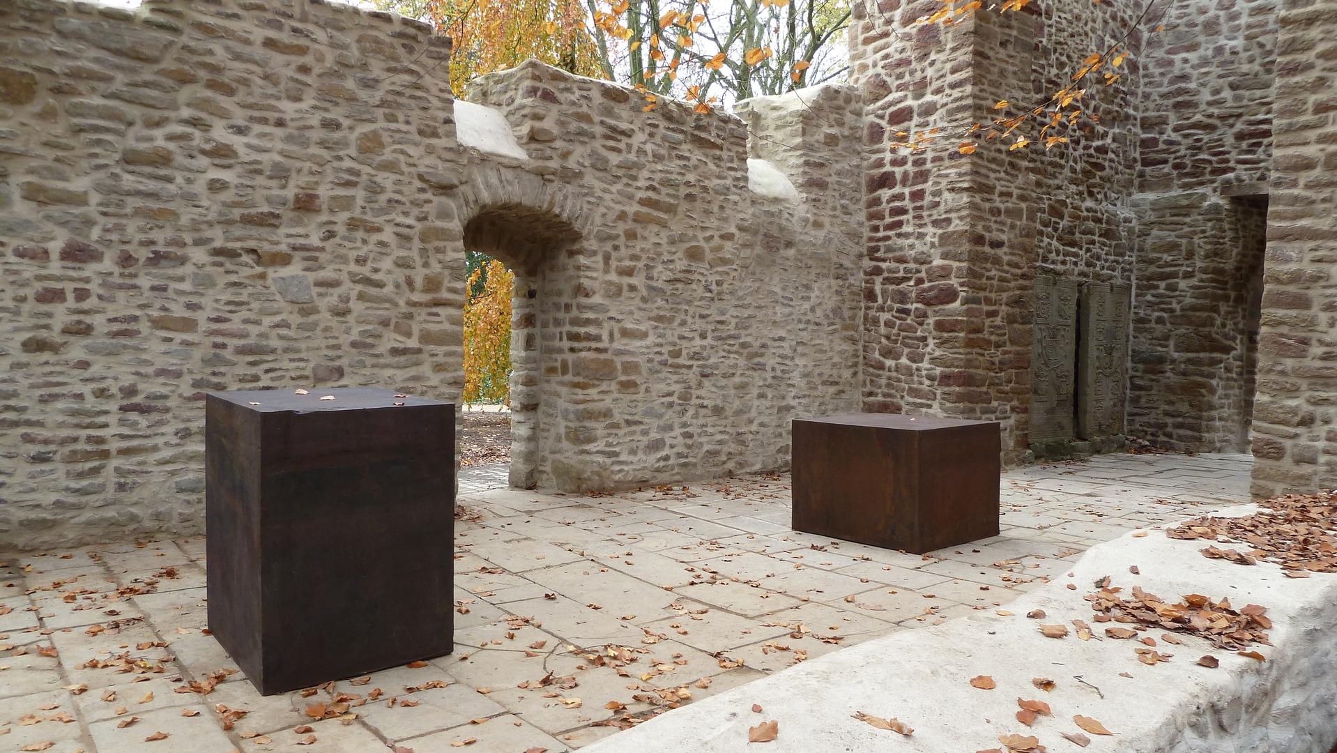 Im Innenraum der gerade frisch restaurierten Ruine der Sylvesterkapelle im Schlosspark Haus Weitmar stehen die beiden Stahlkuben auf der Längsachse des Kirchenschiffs. Die Kapelle stammt aus dem 14. bis 15. Jh. und ist aus Natursteinen gemauert. So sind die beiden auf der ehemaligen Henrichshütte im benachbarten Hattingen aus Cortenstahl geschmiedeten Kuben die einzigen rechtwinkligen Objekte im Raum. Eine zusätzliche Irritation ergibt sich aus der Tatsache, dass die Oberflächen der Stahlkuben wegen des schiefen Natursteinbodens der Ruine nicht parallel zueinander stehen.