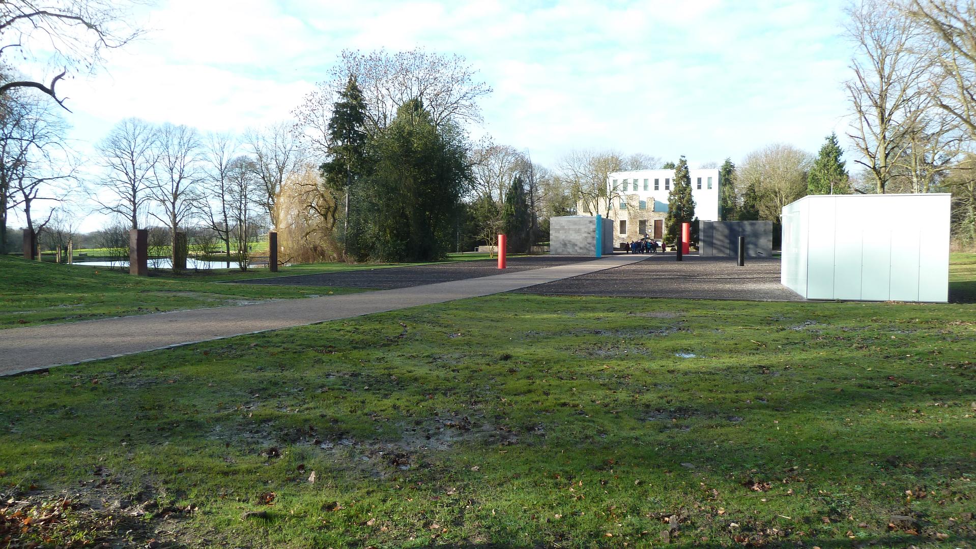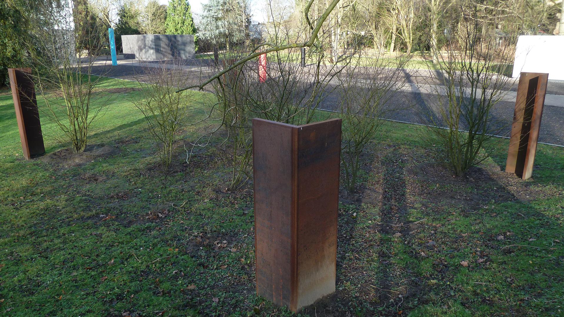 Die vierte Ecke bleibt frei, außerhalb der Gebäudefläche ist aber mit stehende Winkeln aus CorTen-Stahl ein bepflanztes Viereck markiert, das die Verbindung zum umgebenden Kunst-Park mit Werken von Lee Ufan, François Morellet, David Rabinowitch, Ulrich Rückriem, Richard Serra, Giuseppe Spagnulo und Erich Reusch selbst herstellt und öffnet.