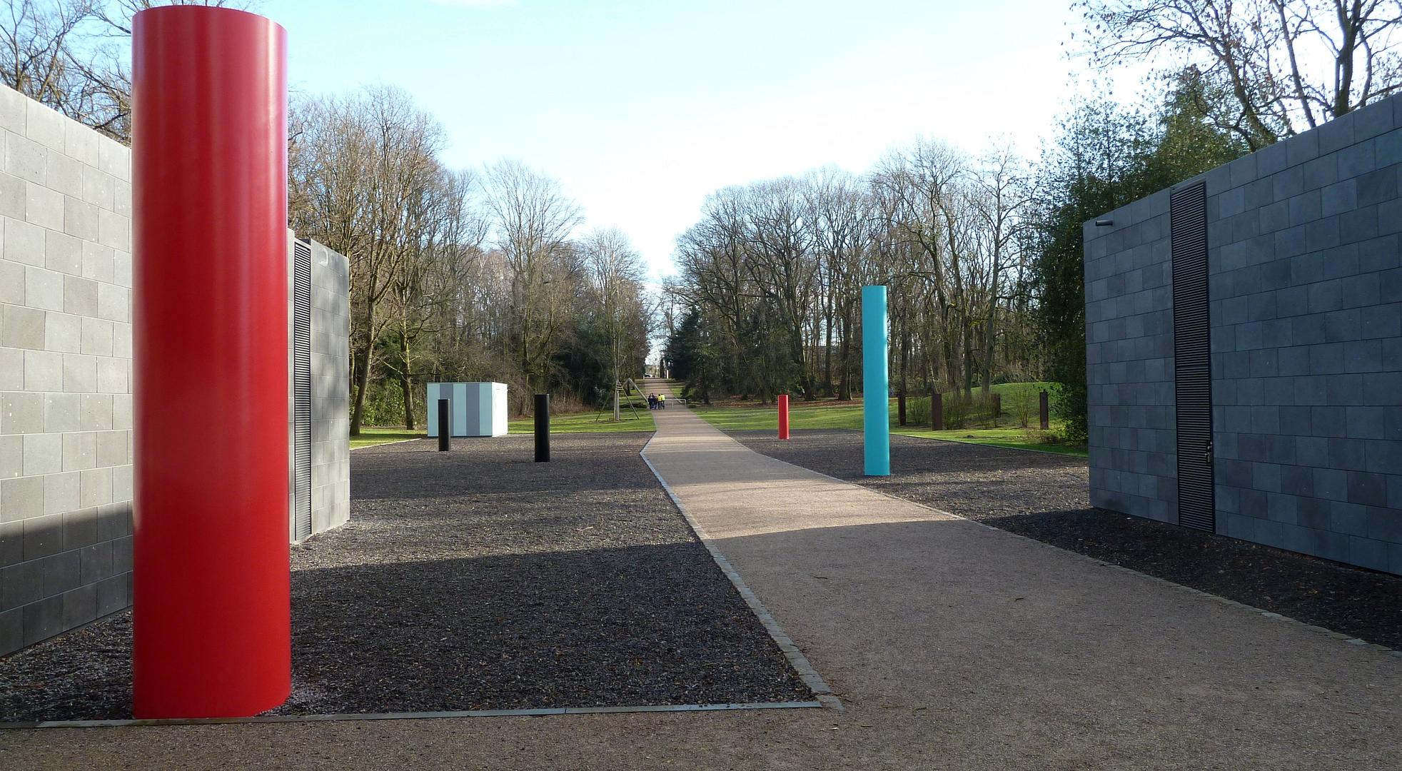 Zwei signalrote, zwei schwarze und eine cyanblaue Säule sorgen für dynamisch wechselnde Raumbezüge, die sich mit jedem Schritt neu und anders erfahren lassen.