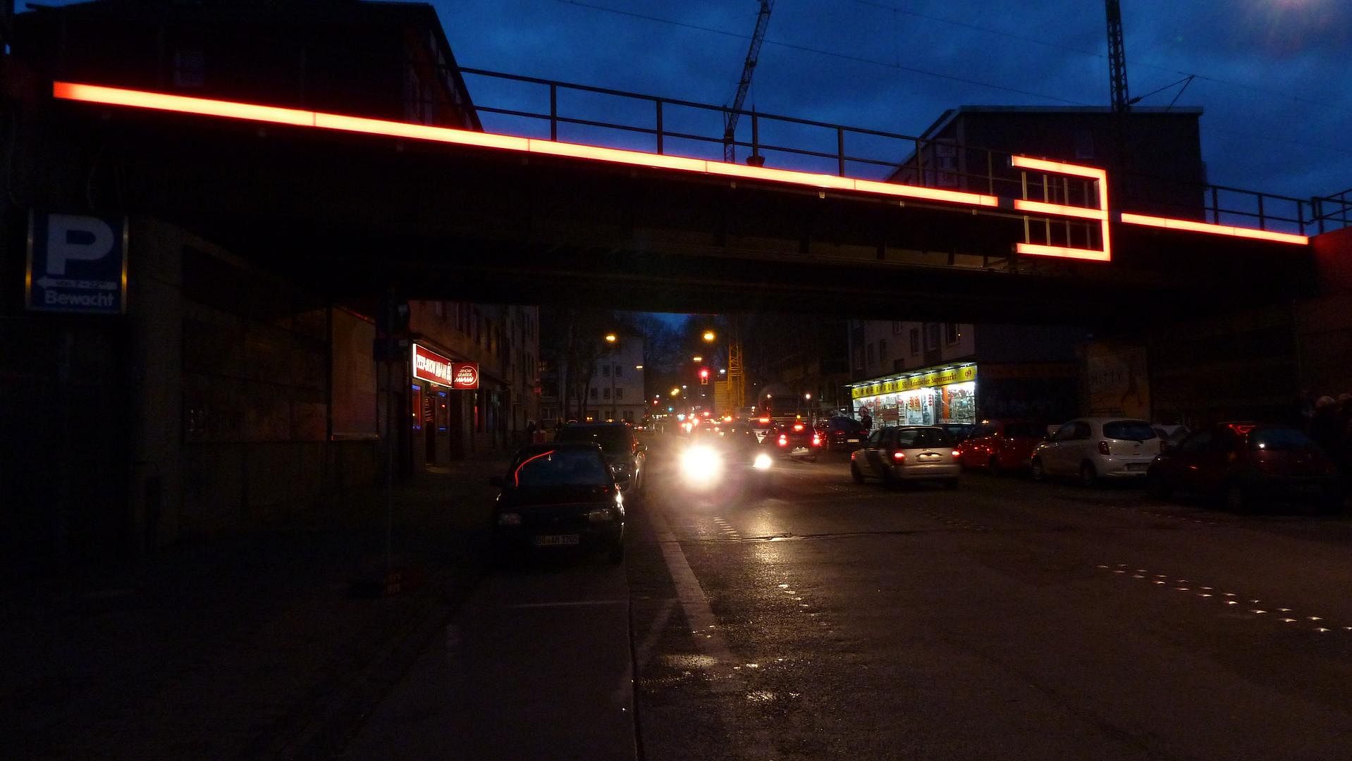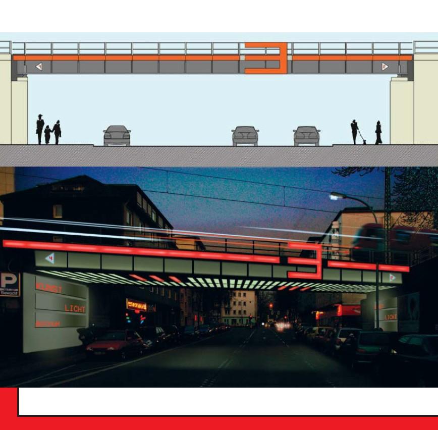 Im Vergleich der Realisation mit dem Entwurf ist leicht zu erkennen, dass nur der zweite Schritt tatsächlich ausgeführt wurde. Die Unterleuchtung der Brücke und die Beleuchtung der horizontal ausgerichteten Metalltafeln fehlen - aus Kostengründen.