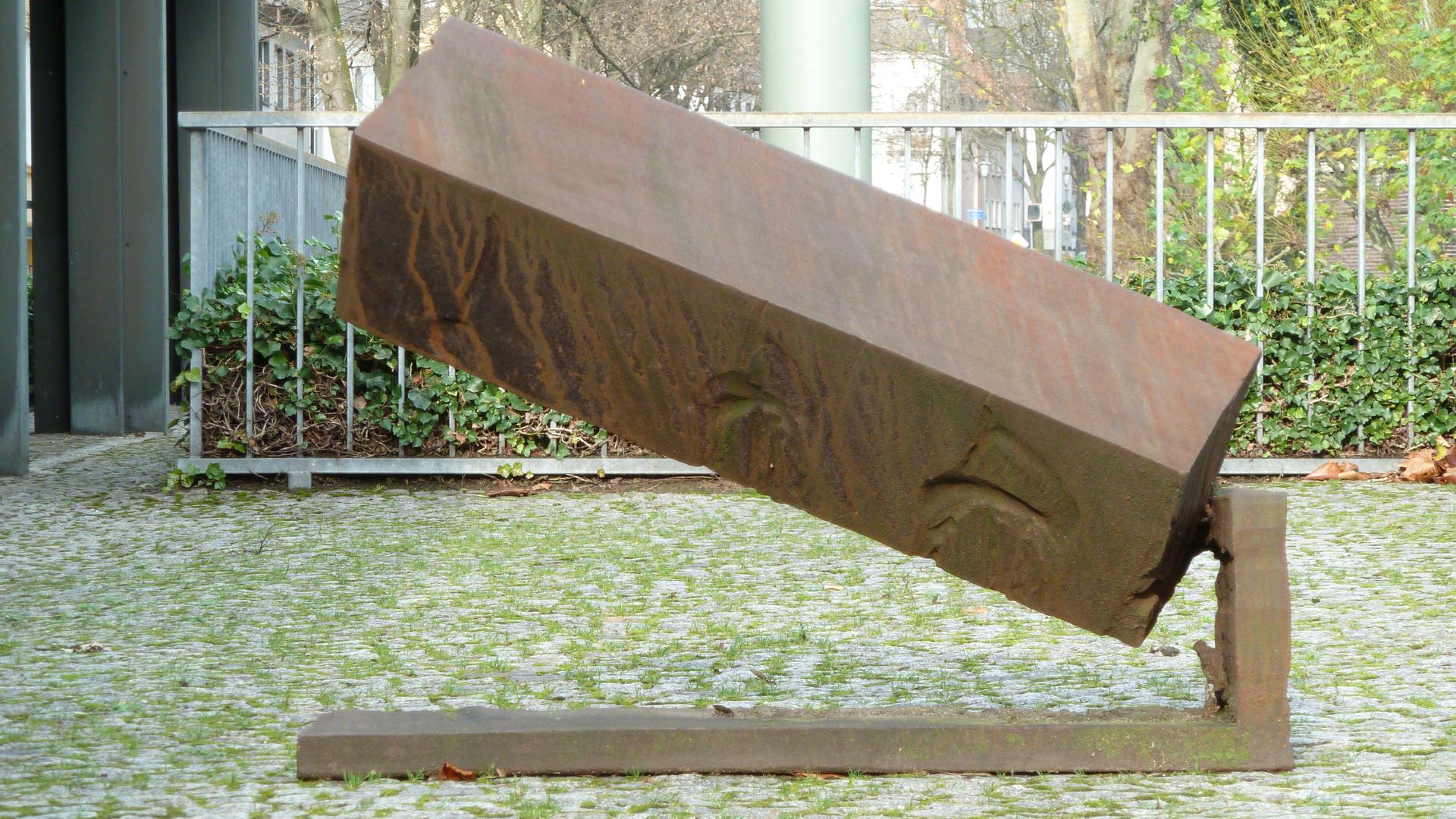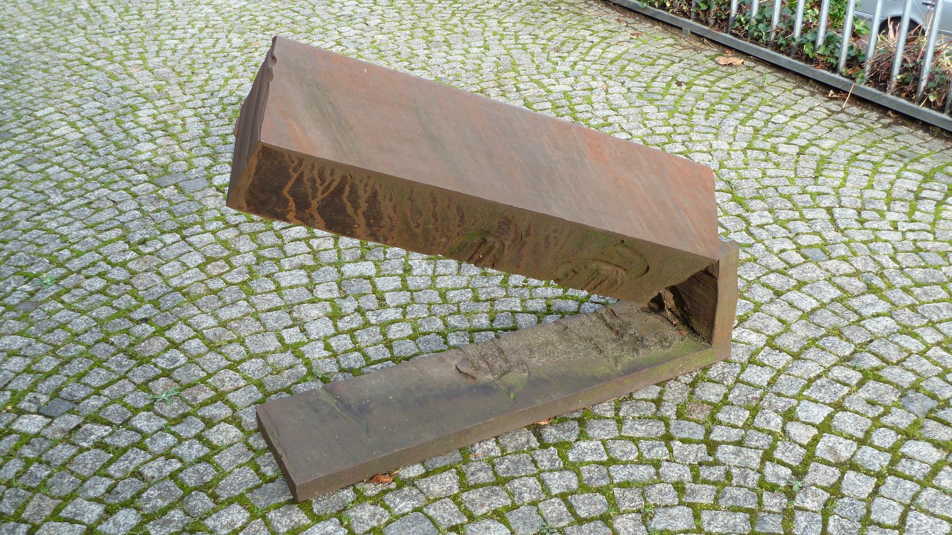 Eine industriell vorgefertigte quaderförmige Eisenbramme bildet das Ausgangsmaterial. Die Bramme hat Spagnulo mit dem Schneidbrenner aufgeschnitten. Die unregelmäßige, schartige Schnittfläche macht die Gewalt des Eingriffs sichtbar. Die Verletzung des Materials durch den Arbeitsprozess ist Teil des Werks. Im Lauf der Zeit werden die Spuren durch Korrosion und Materialalterung überlagert.