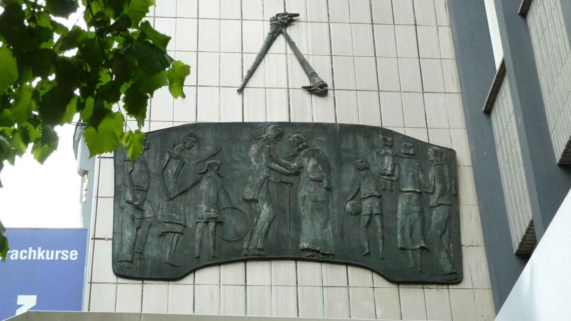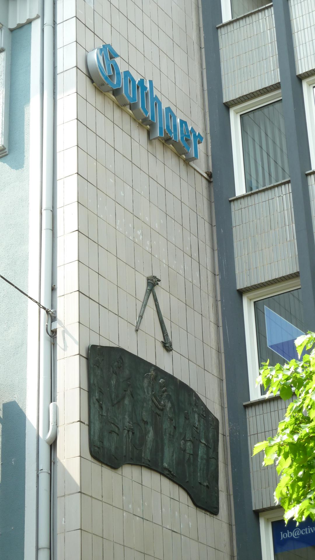 Das etwas versteckte Relief am Geschäftshaus Kortumstraße 47 ist klassische Kunst am Bau. Unbetitelt und ohne Beschriftung steht es doch in engstem Zusammenhang mit dem Geschäftszweck. Heute lässt sich diese Beziehung nicht mehr ohne Weiteres entschlüsseln, aber 1958, zur Entstehungszeit des Gebäudes, war der Zusammenhang zumindest den Kunden der Gothaer Lebensversicherung sonnenklar.