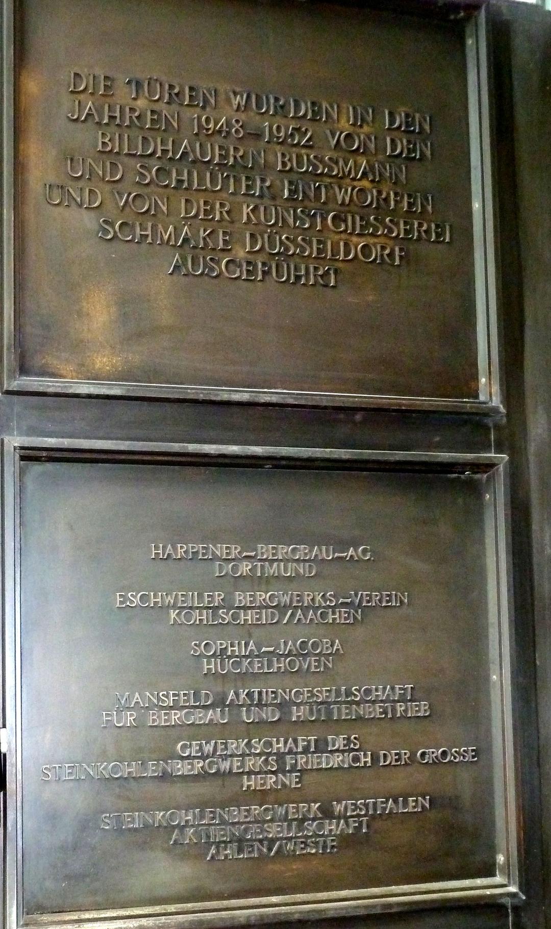 Die drei wuchtigen Doppeltüren am Haupteingang zum Deutschen Bergbau-Museum tragen dreißig Bronzereliefs zu Themen und Geschichte des Bergbaus. Nicht weniger als sechsunddreißig Bergwerksgesellschaften haben durch ihre Spenden das Bronzeportal finanziert. Im Jahr 1953 wurden die von den Düsseldorfer Bildhauern Otto Bussmann und Maria Schlüter gestalteten Reliefs in die Portale eingelassen.