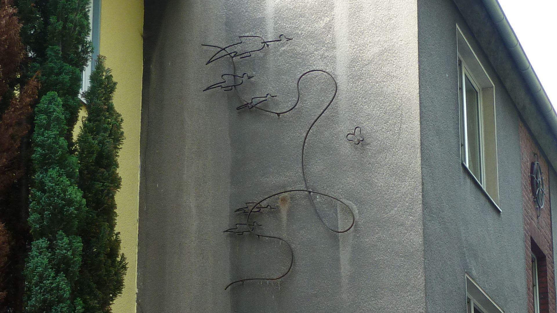 Gut versteckt befindet sich an der nördlichen Giebelwand der Häuserreihe am Steinring 19 ein kleines Drahtrelief mit einem Vogelflugmotiv.