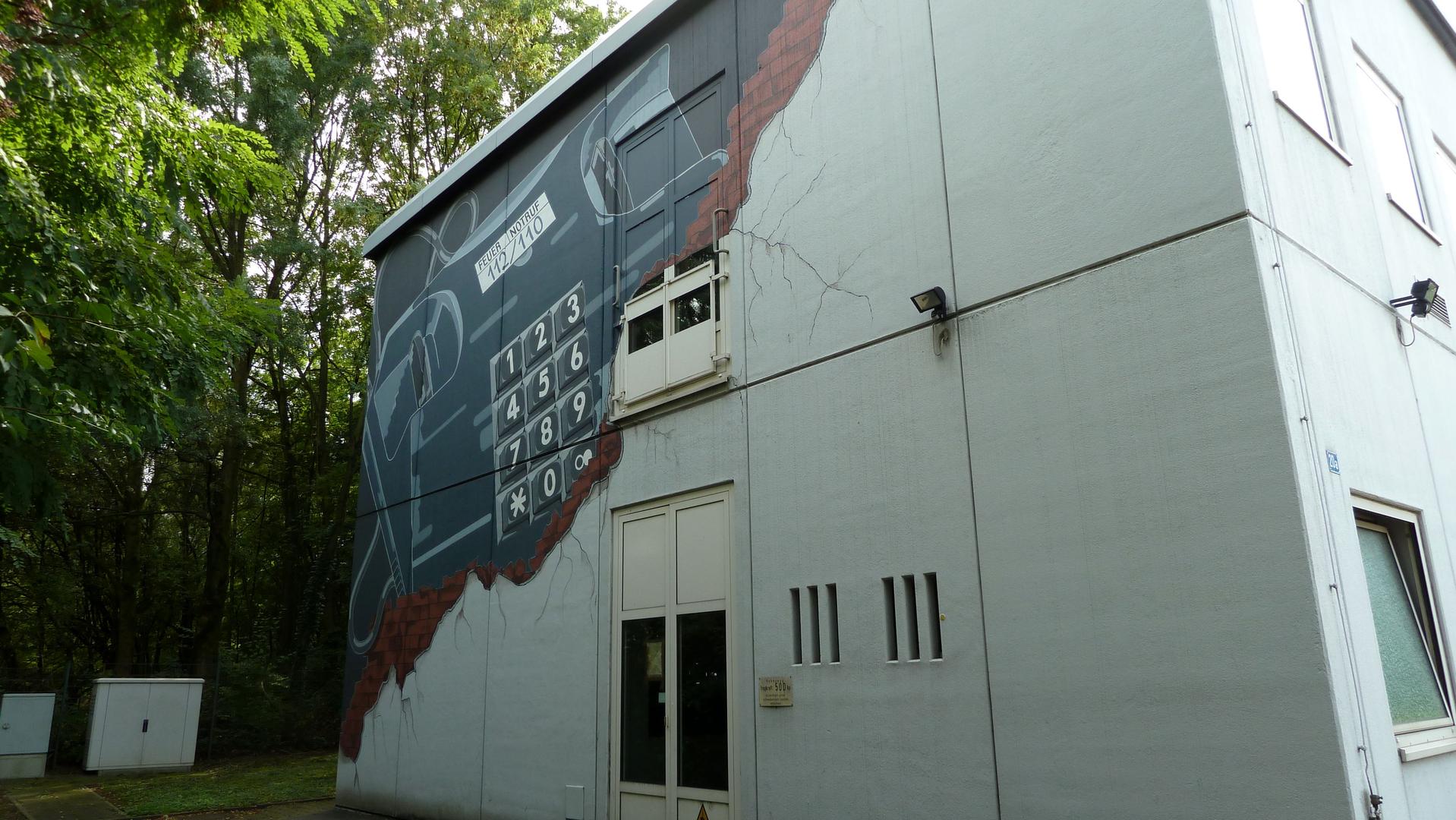 Das Bild des Telefongeräts befindet sich auf der östlichen Querwand, während der Hörer auf die südliche Längswand gemalt ist. Die Illusionsmalerei muss also die Ecke des Gebäudes in dem Wandbild verschwinden lassen. Die Schwierigkeit wird hier elegant umgangen, indem die Beiden Hauptteile des Bildes, Telefonapparat und Hörer sich jeweils vollständig auf getrennten Wandflächen befinden.