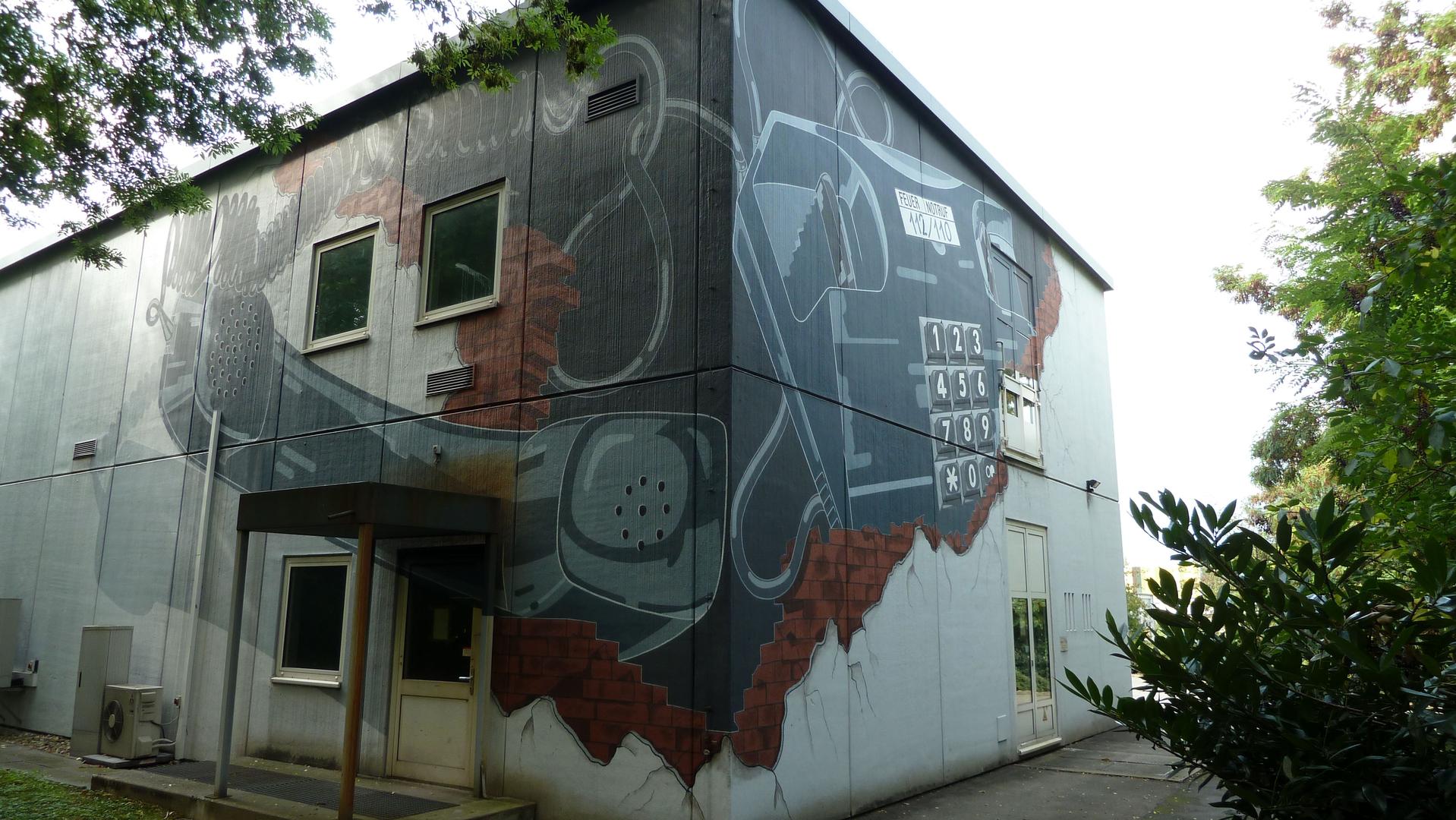 Das spektakuläre vorwiegend in Blau- und Grautönen gehaltene Wandbild zeigt ein Tastentelefon vom Typ „FeTAp 755“ wie es von der damaligen Deutschen Bundespost seit etwa 1975 den Kunden angeboten wurde. Das Telefon befindet sich scheinbar noch hinter einer bereits durchbrochenen Ziegelwand, während der frei schwebende Hörer sich bereits vor der Außenwand befindet und sogar einen Schatten auf die Wand wirft.