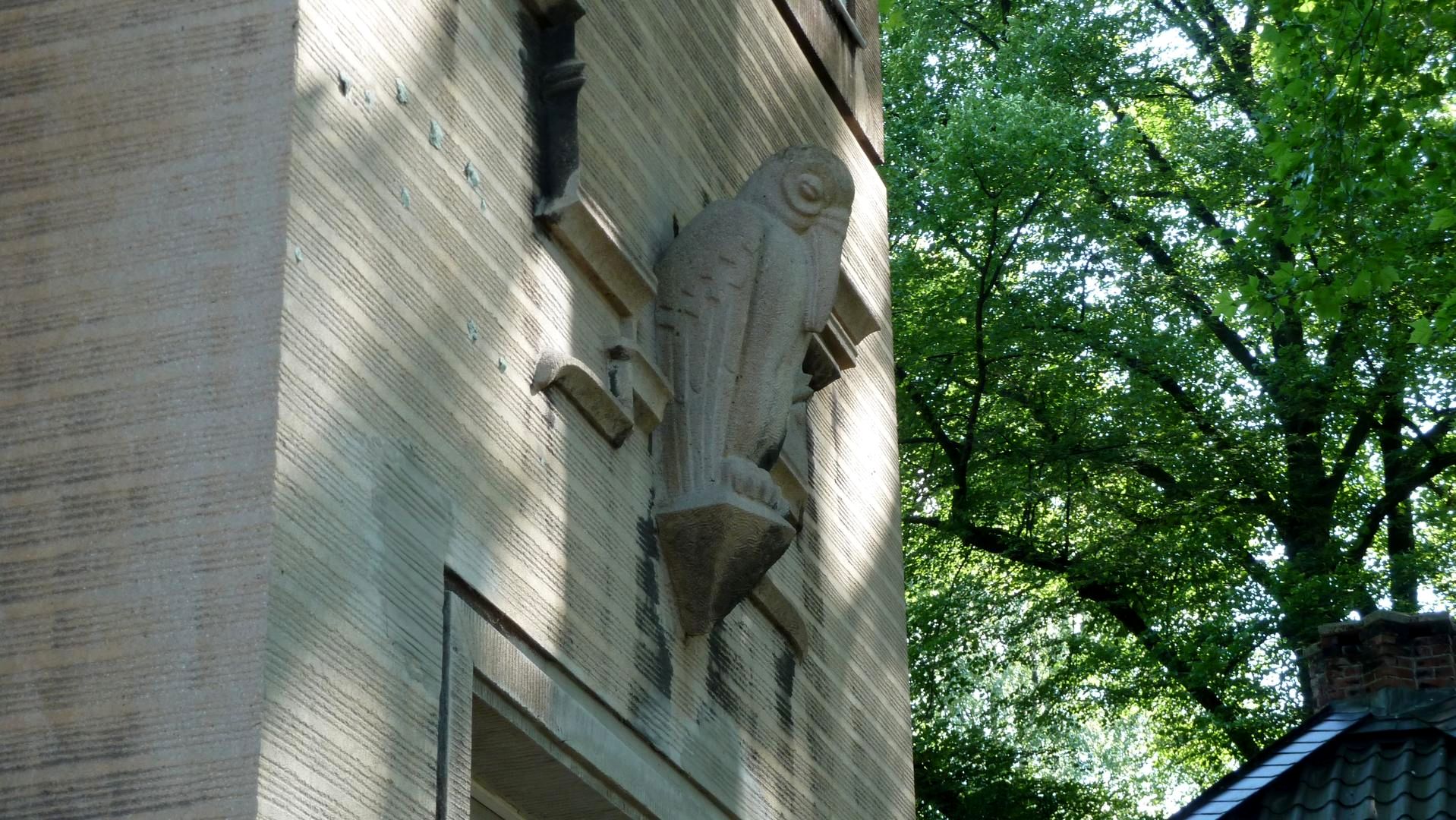 Das 1925/26 als Wohnhaus des Stadtpark-Wächters errichtete Gebäude ist an der Giebelseite mit einem stilisierten Vogel geschmückt. Der lange Schnabel läßt an einen Pelikan denken, die Gestalt und die Augen erinnern an eine Eule.