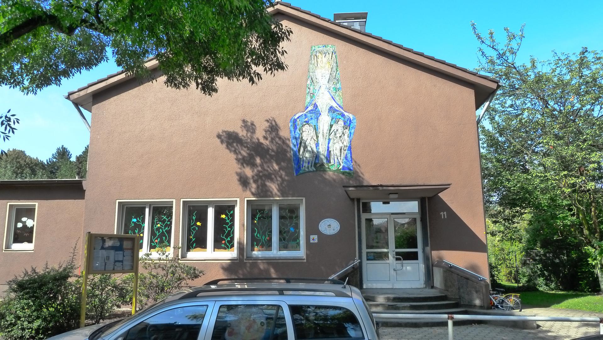 Eine weitere Schutzmantelmadonna, diesmal als Kupferrelief, findet sich an der - ehemals katholischen - Städtischen Gemeinschaftshauptschule an der Stiftstraße.