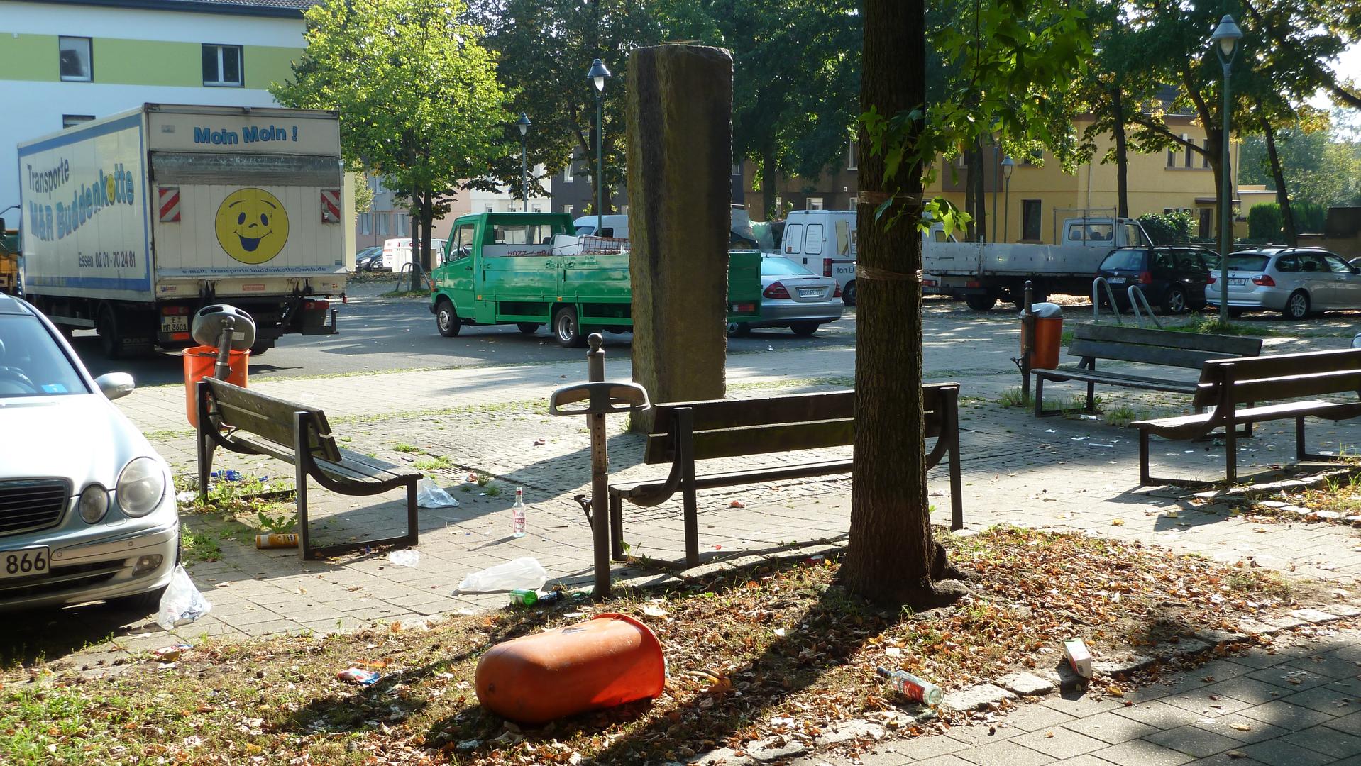 Der Brunnen ist von Sitzbänken umgeben, allerdings lädt die Situation heute nicht unbedingt zum Verweilen ein und der Brunnen ist anscheinend nur selten in Aktion zu erleben.