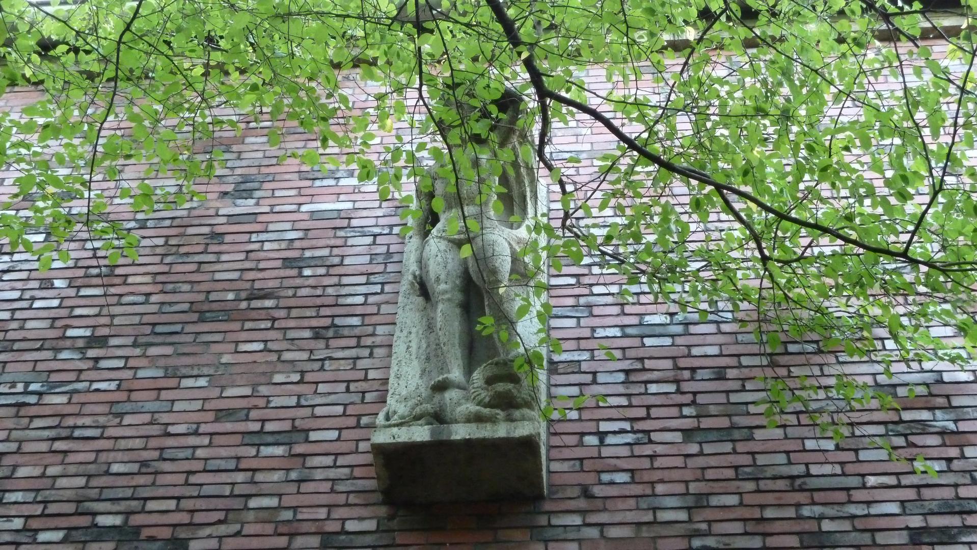 Die ägyptische Göttin Kadesh wird auf mehreren Reliefs und Wandbildern auf einem Löwen reitend bzw. stehend dargestellt. Möglicherweise nimmt die Steinfigur an der Schiller-Schule - ursprünglich ein Mädchengymnasium - hierauf Bezug.