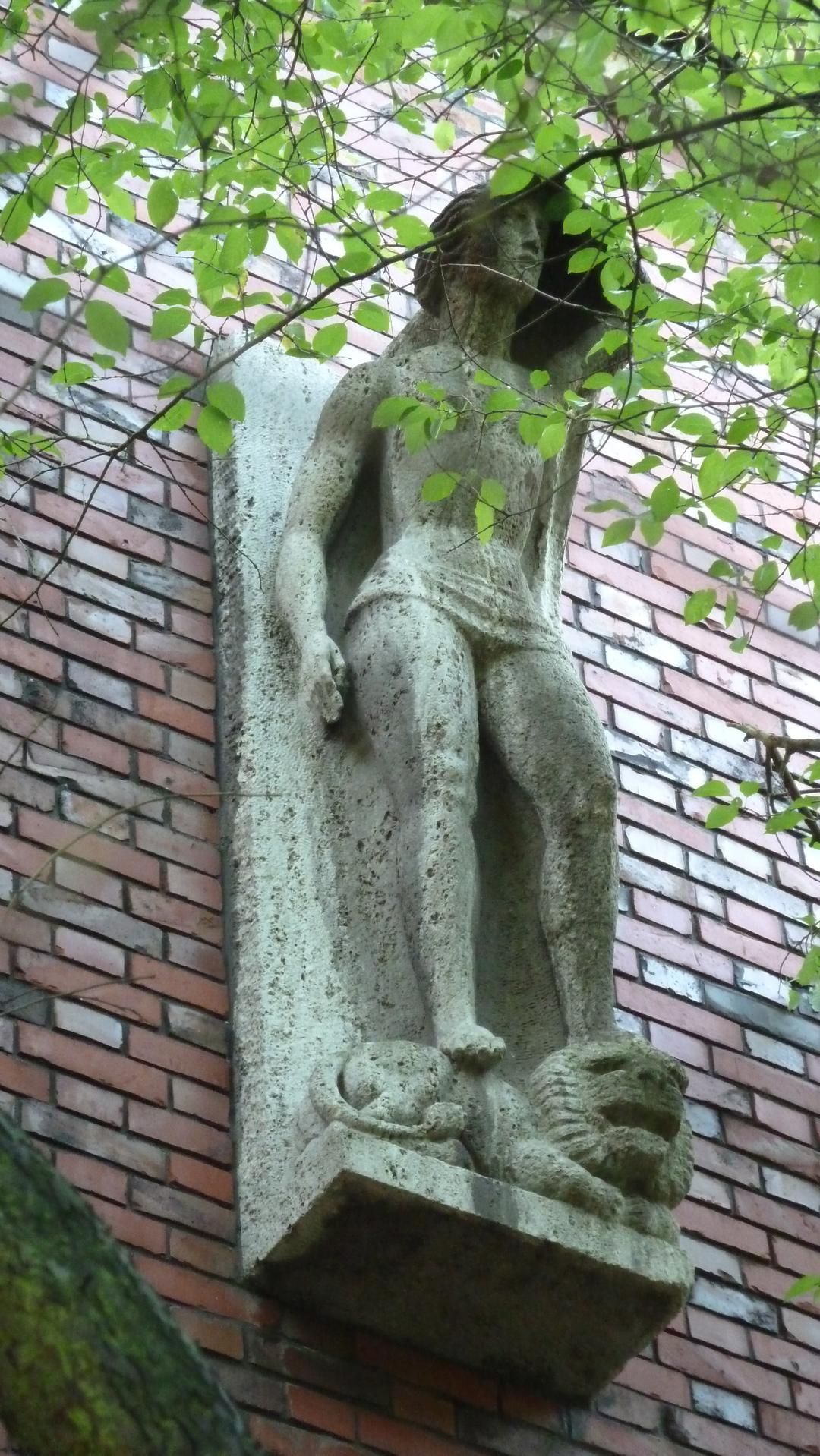 An der Stirnwand der Aula der Schiller-Schule, zum Waldring hin, ist über Kopfhöhe eine Steinskulptur angebracht, die eine Frauengestalt zeigt, die auf einem Löwen steht. Sie zieht das Ende eines Lendentuches wie ein Segel über Rücken und Kopf.