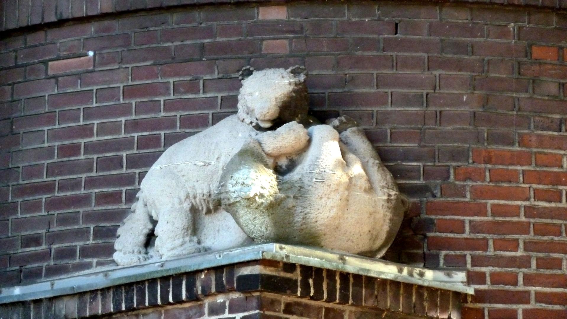 An dem Nebengebäude links neben der Schule befindet sich über einem runden Erker ein Steinrelief, das zwei Bärenjunge im Spiel zeigt.