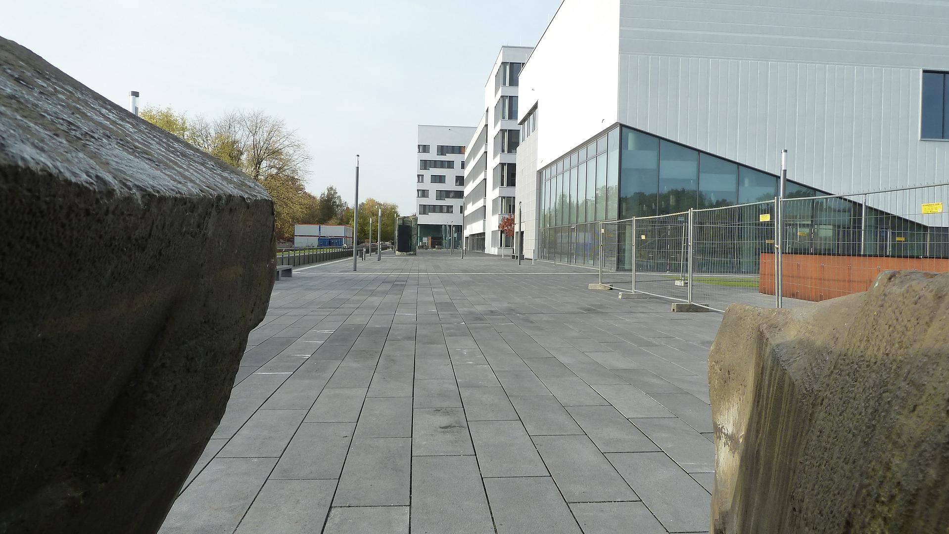 Die zukünftigen Standorte der zweiteiligen Skulptur „Limp“ kann man an den vom Künstler bezeichneten „Interimsplöpseln“ erkennen, die sich zum Schutz der Unterkonstruktion bereits jetzt auf der Treppe und auf der Terrasse befinden.