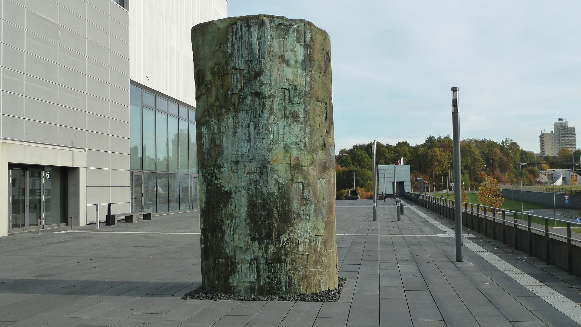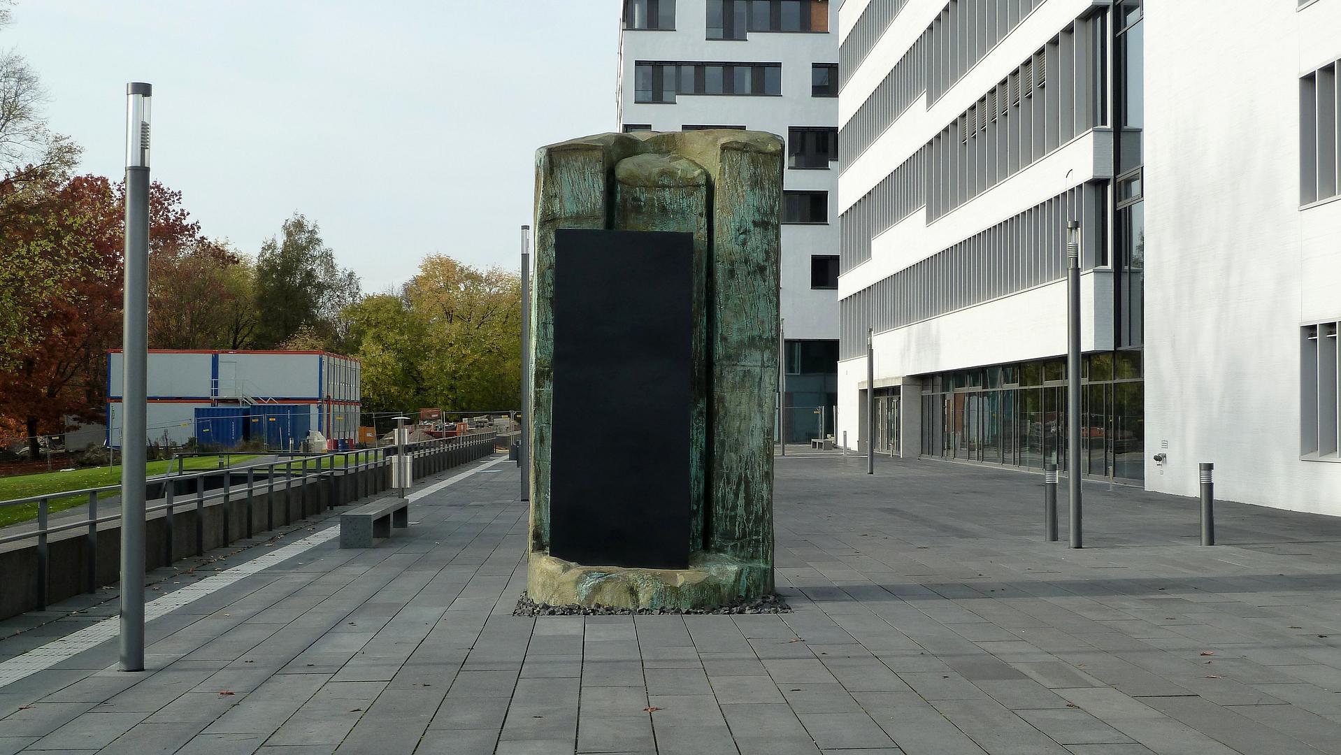 Im Zentrum steht eine vier Meter hohe zylindrische Form aus Bronze, zur Hälfte aufgeschnitten. Krebber verarbeitet Bronze als Symbol für Stabilität und erinnert damit an klassische Körperdarstellungen. In die Schnittstelle fügt er aber einen Kern aus Gummi, das weich und elastisch der menschlichen Haut nicht unähnlich ist. Der zweite Teil der Skulptur liegt am Treppenaufgang zur Campusterrasse. Dabei handelt es sich um den imaginierten abgetrennten Zylindermantel, der verdreht und zerknautscht auf den Stufen liegt.