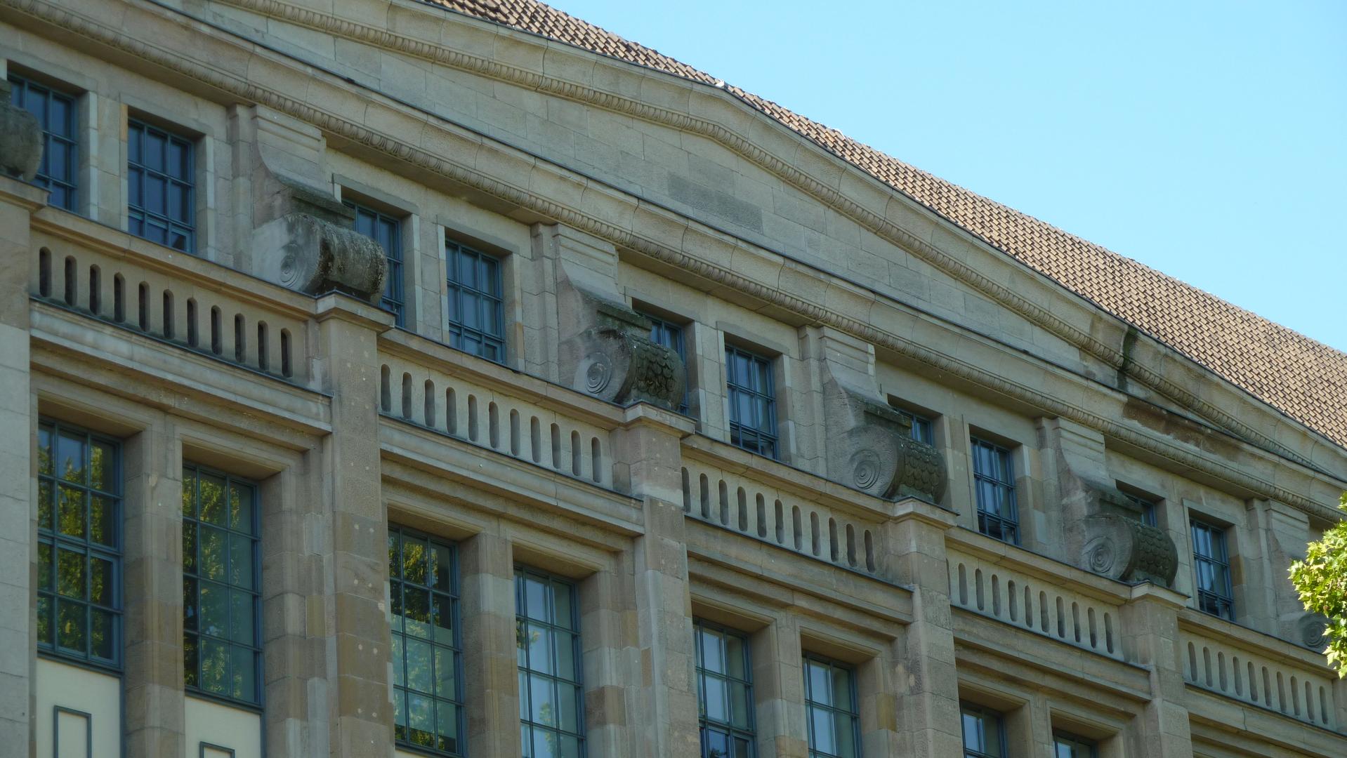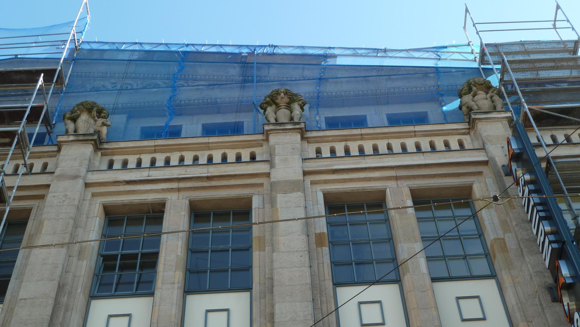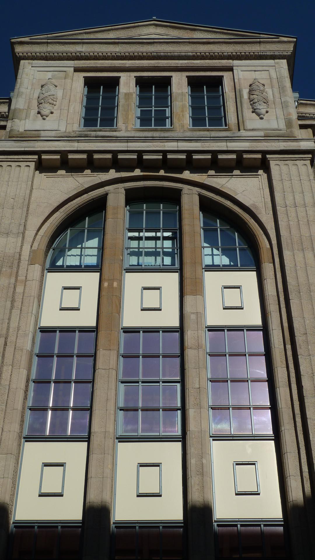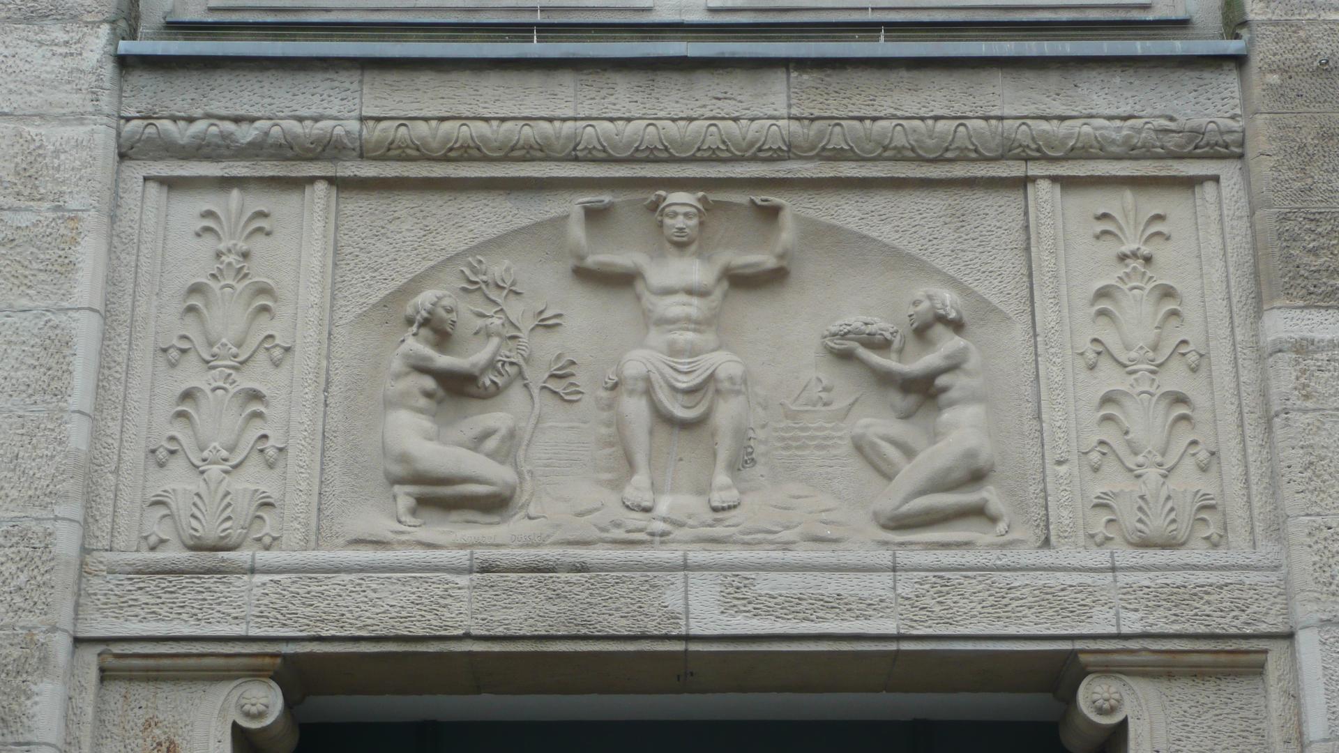 Steinrelief über dem ehemaligen Haupteingang des Kaufhauses Alsberg (jetzt: Kortumhaus) und weitere Schmuckelemente