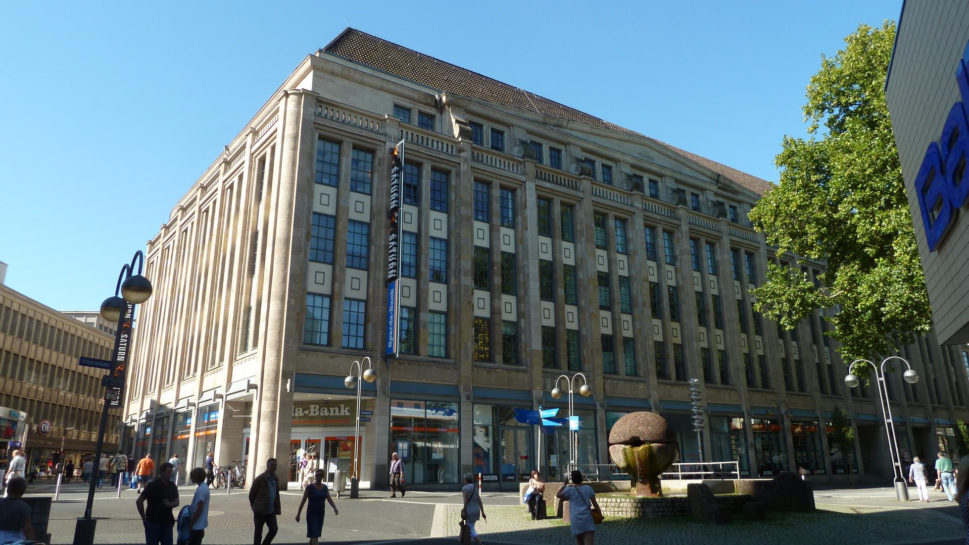 Das Kaufhaus der Brüder Alsberg aus Köln wurde 1915 im Rohbau fertiggestellt und im Ersten Weltkrieg als Lager genutzt. Nach 1918 wurde das Kaufhaus fertiggestellt und 1921 eingeweiht.