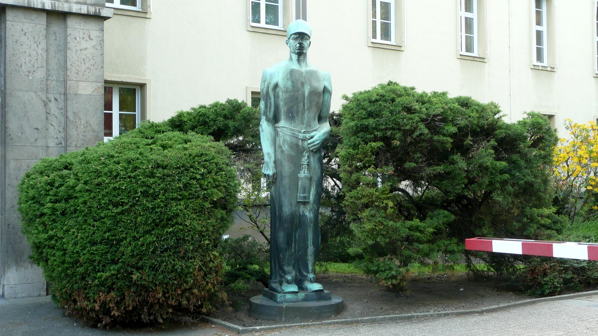 Den Eingangsbereich des Knappschaftsgebäudes an der Pieperstraße flankieren zwei überlebensgroße, etwa drei Meter hohe Bergmannsfiguren. Links steht ein älterer, gebeugter Bergmann, rechts - ganz aufrecht - ein junger, starker Mann. Wie weit ist die Formensprache von der erst fünf Jahre vorher beendeten Zeit des Nationalsozialismus entfernt?