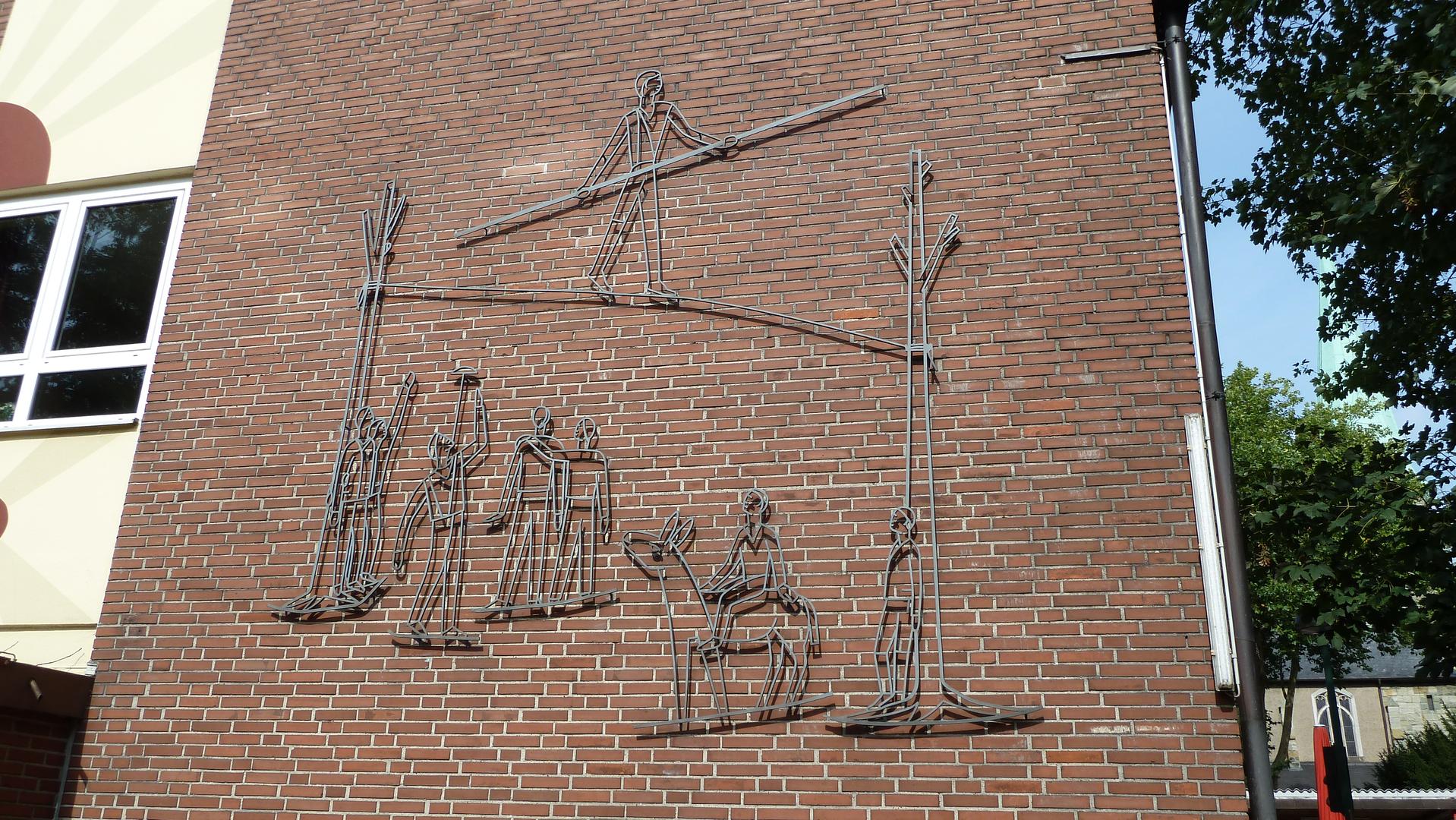 Im Hof des katholischen Kindergartens St.Johannes in Wattenscheid befindet sich an einer Hauswand ein Drahtrelief. Es entstand ca. 1960 beim Bau des damaligen Don-Bosco-Heims und zeigt folgerichtig eine symbolische Szene aus dem Leben des namengebenden italienischen Priesters Don Bosco (1815-1888). Don Bosco wurde 1841 zum Priester geweiht und begann, für arme und benachteiligte Jugendliche in Turin zu arbeiten. 1859 gründete er den als Salesianer Don Boscos bekannt gewordenen Orden. 1872 kam die Ordensgemeinschaft der Don-Bosco-Schwestern dazu.