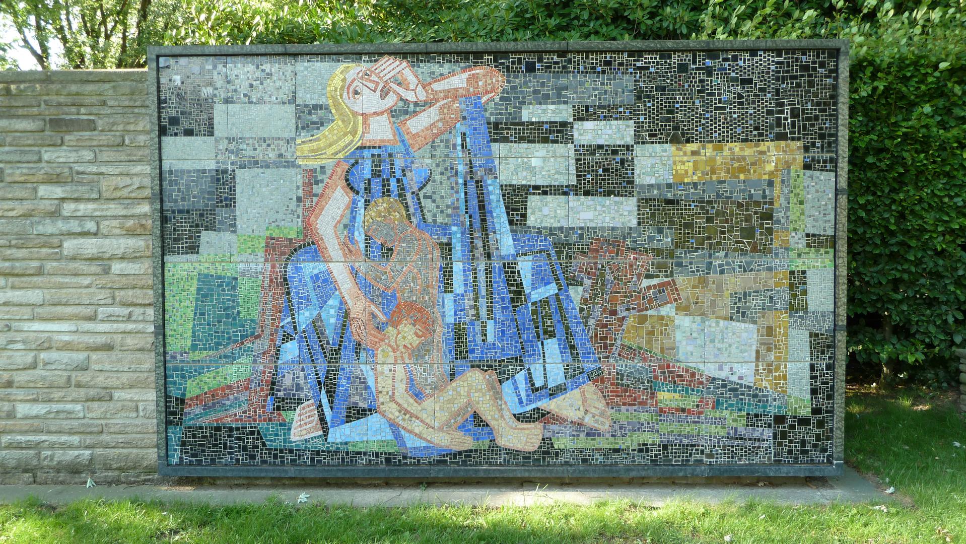 Einer Anregung von Stadtbaurat Clemens Massenberg folgend, beauftragte der Rat den bekannten Bochumer Glasmaler Ignatius Geitel 1953 mit dem Entwurf eines Mosaiks, das als Motiv eine klagende Mutter zeigen sollte. Ignatius Geitel hat diesen Entwurf, wie es bei ihm die Regel war, eigenhändig kunsthandwerklich umgesetzt. Er unterteilte die ca. 4 Meter lange und 2,40 Meter hohe Bildfläche in 40 etwa gleichgroße Felder und fügte in ihnen Steinchen für Steinchen zusammen; alles in allem sollen es rund 40.000 sein. Die Mosaiksteinchen schlug er selbst aus opakartigem Glasfluss, der als besonders widerstandsfähig galt und seine Farbkraft lange behalten würde. In seiner Werkstatt in dem alten Maschinenhaus der stillgelegten Zeche Carl Friedrichs Erbstollen in Stiepel dauerte es mehr als ein Jahr, bis das Mosaik fertig war. Unmittelbar vor dem 4. November 1954, dem Zehnten Jahrestag des furchtbarsten Bombenangriffs auf Bochum, war das Mosaik fertiggestellt.