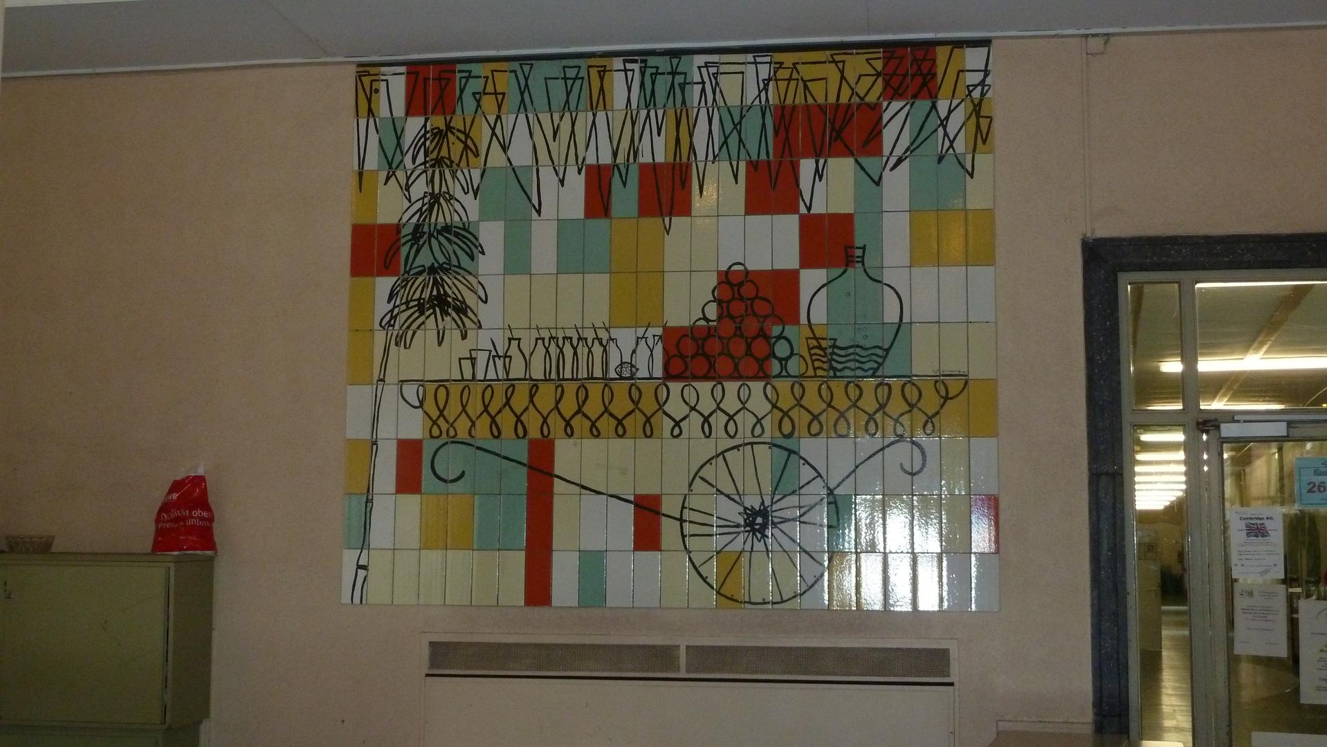An der Rückwand der Pausenhalle findet sich ein für die 1950er Jahre überaus typisches Mosaik.