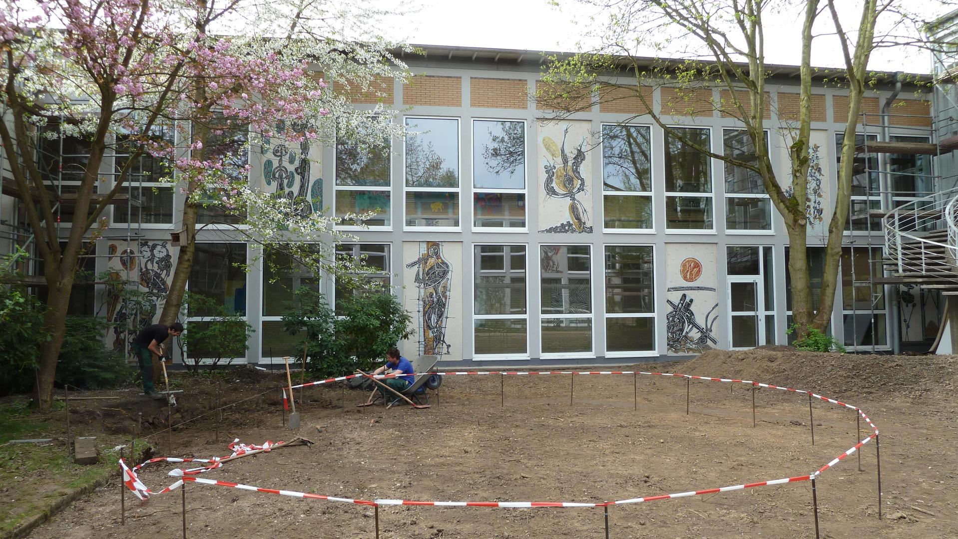 Im Innenhof der Schule hat Heinrich Wilthelm 14 Glasmosaike gestaltet, die im Wechsel mit den Fensterflächen die Wände zum Leben bringen. Die bewegten, abstrakten Bilder erschließen sich nicht auf den ersten Blick. Sie erinnern stilistisch an farbige Linolschnitte. Dargestellt sind Themen aus antiker Mythologie und Dichtung.