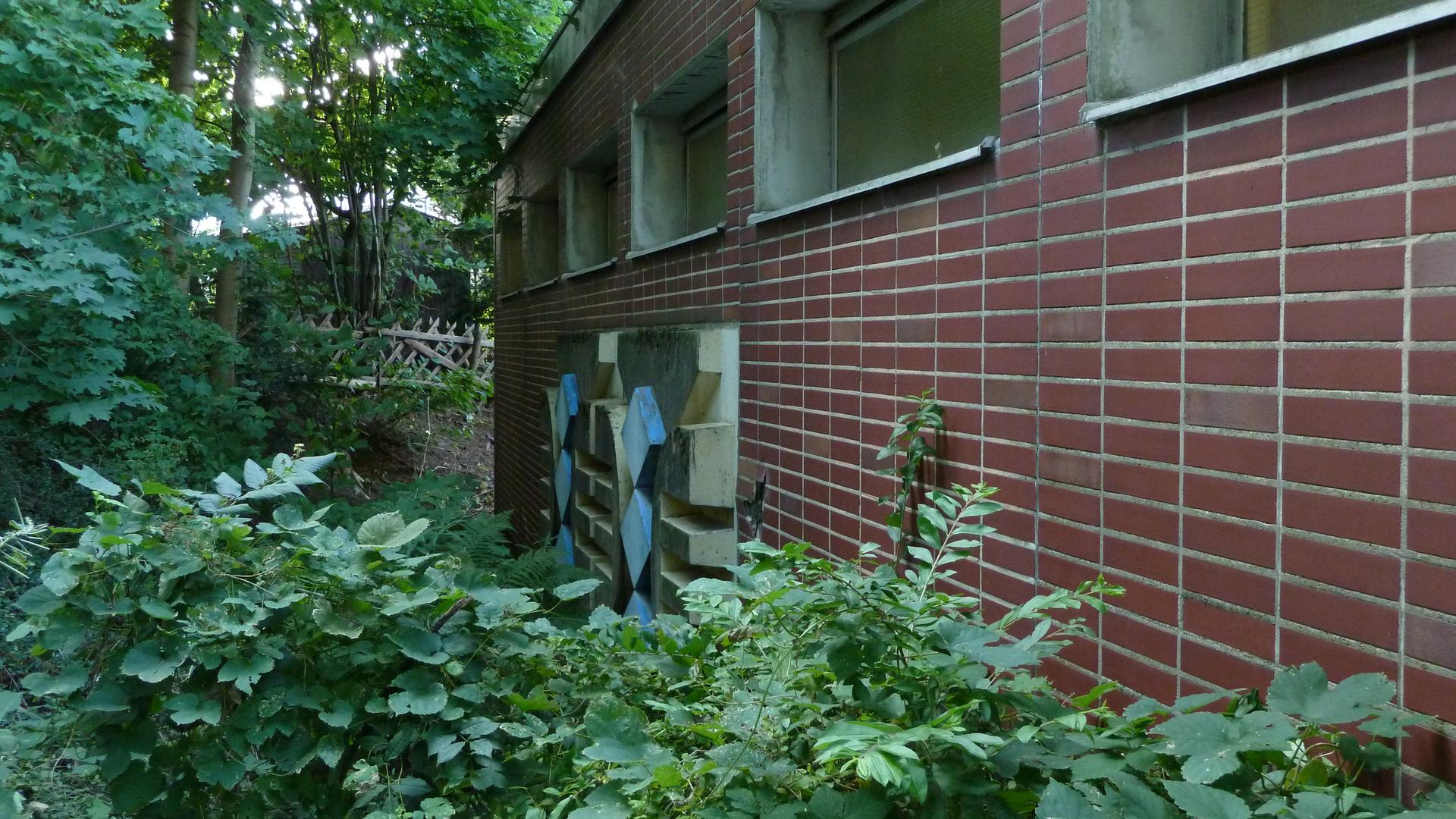 Für das Schulzentrum gestaltete Hajek im Unterschied zu den anderen Schulen nicht nur Gebäudefassaden, sondern zusätzlich eine farbige Beton-Plastik auf dem Schulhof, das Maßzeichen .
